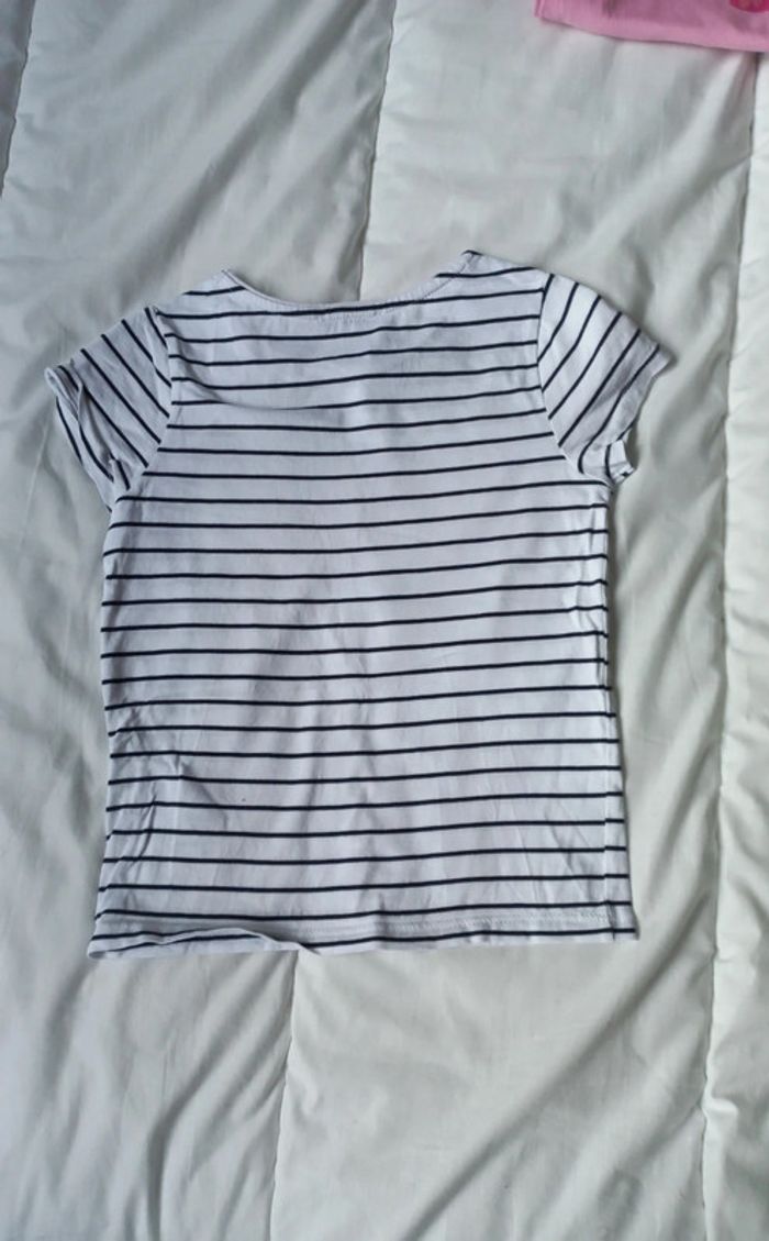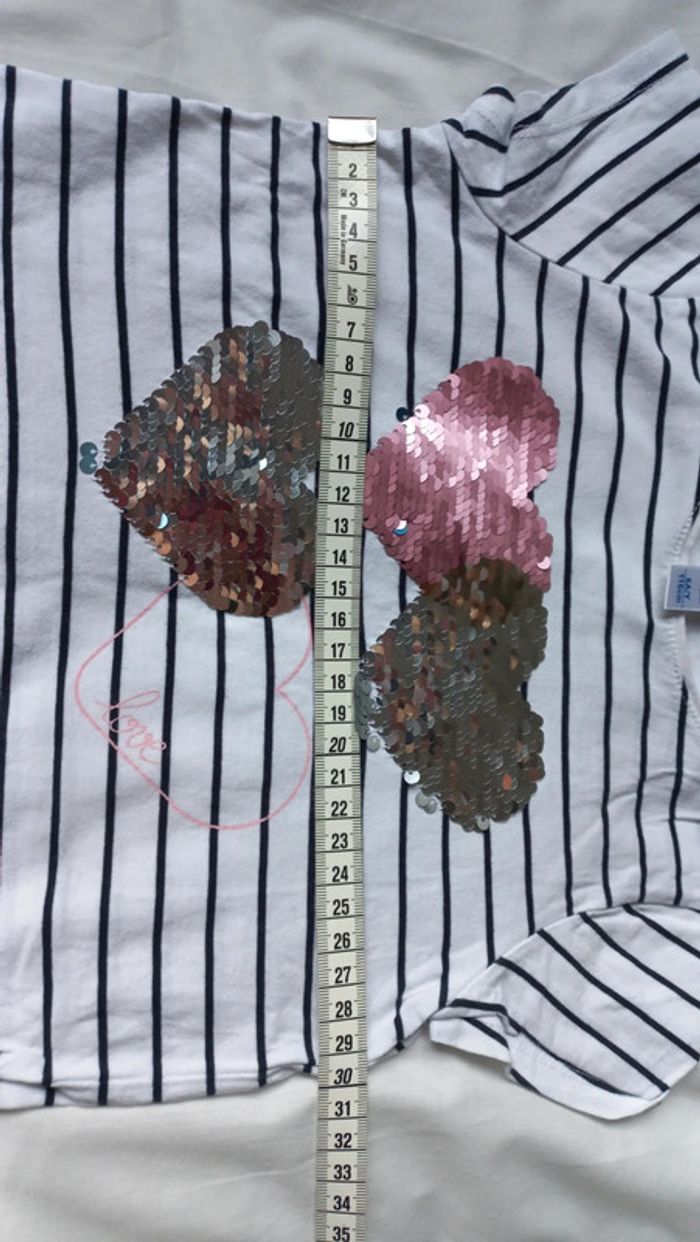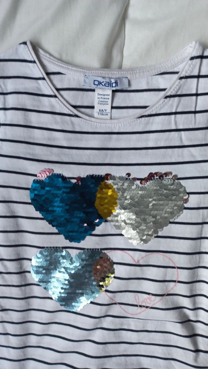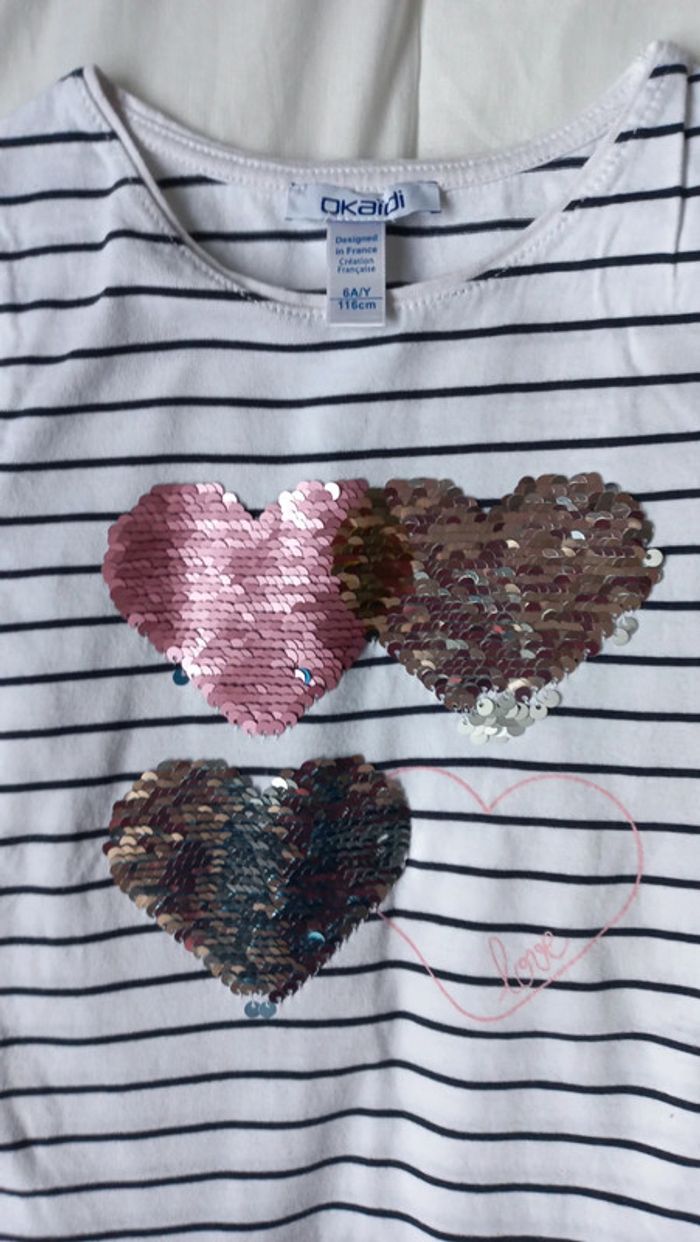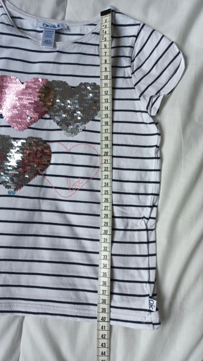 T-shirt okaidi taille 6 ans Voir mesures sur photos Blanc rayé marine type marinière Avec cœurs strass réversibles #scara5ans #scara6ans