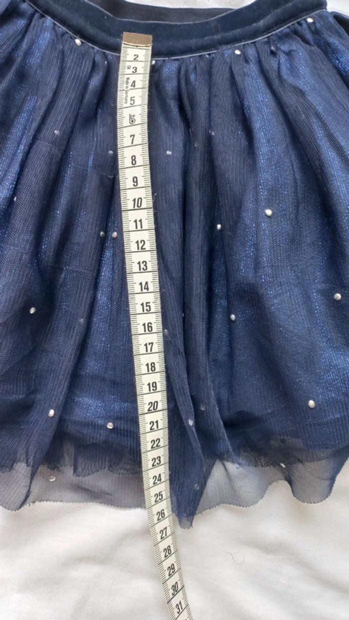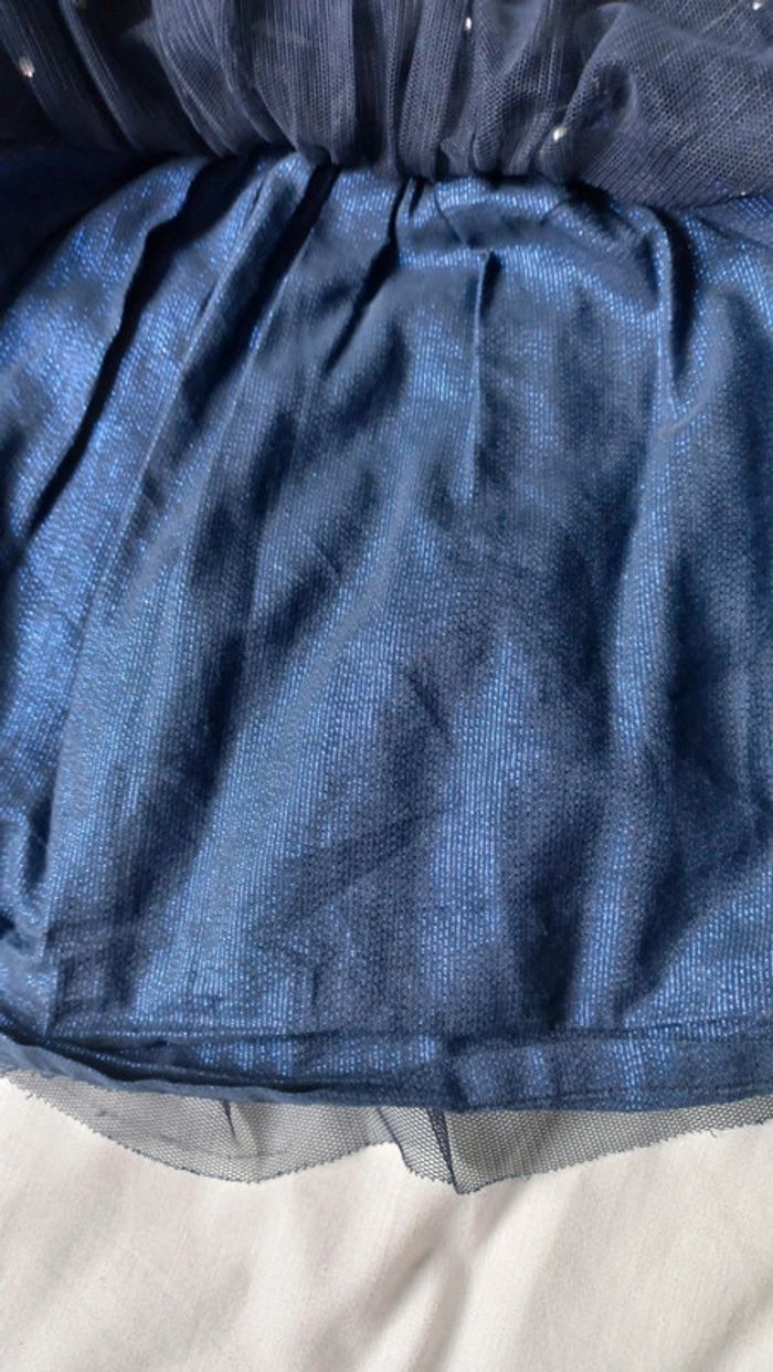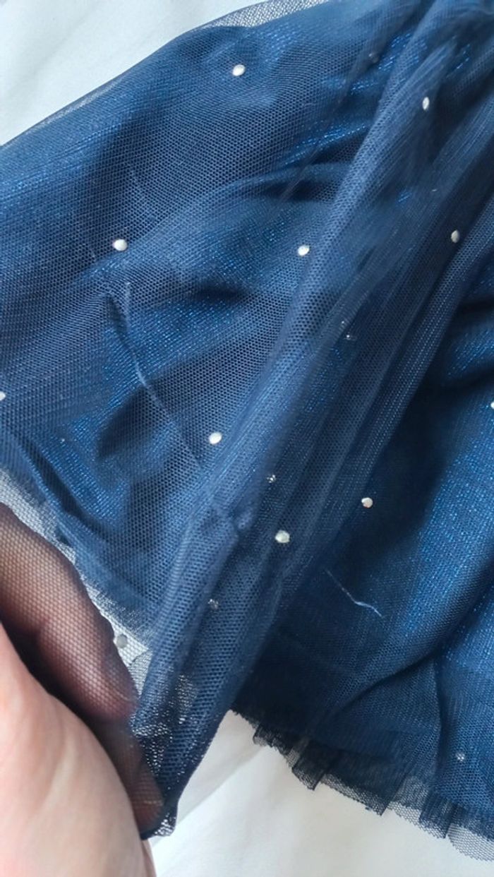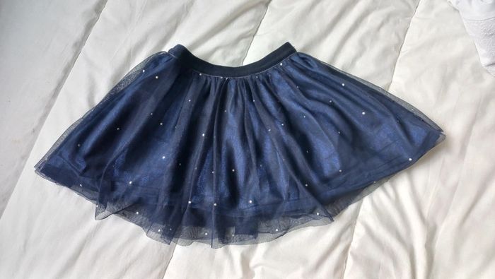 Jupe bleu foncé/ bleu marine Avec pois argentés Taille élastique Okaidi okaïdi taille 4 ans voir dimensions sur photos 4 épaisseurs Quelques fils tirés sur la tulle voir 2 dernières photos, ne se voient pas trop #scara3ans #scara4ans #scara5ans