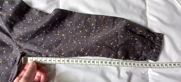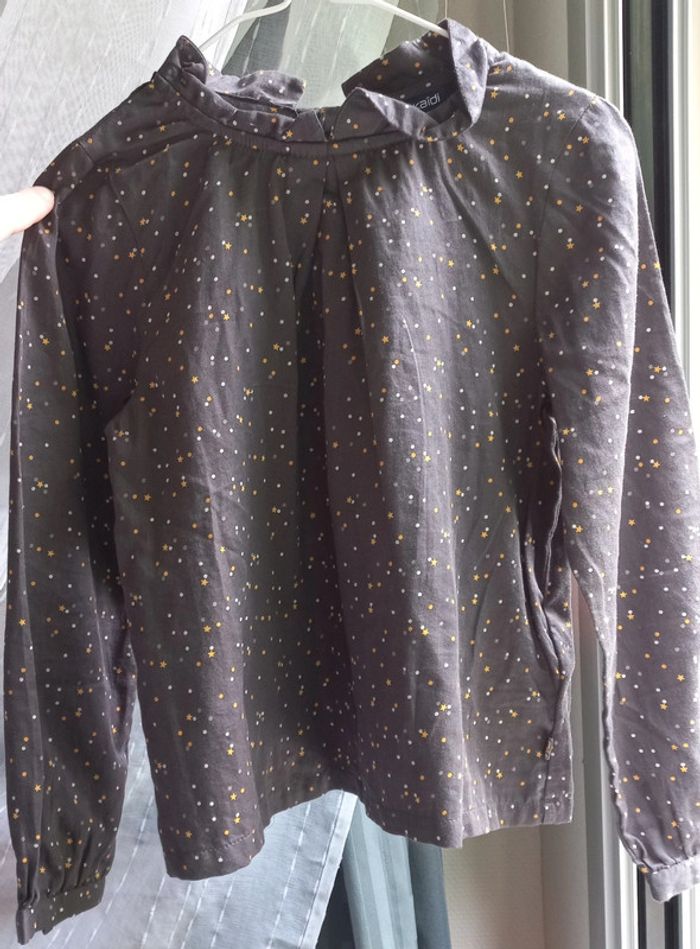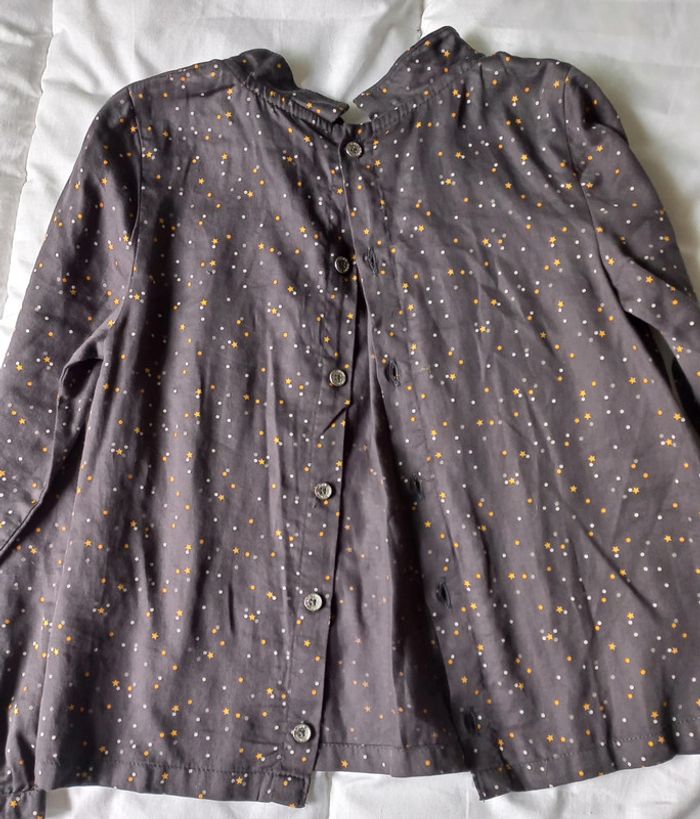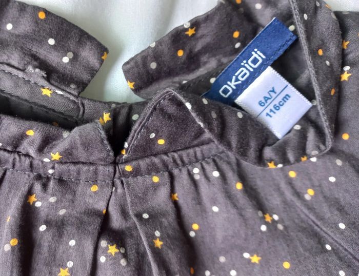 Chemise chemisier okaïdi avec petit col Taille 6 ans Gris motif étoiles et pois jaune et blanc Se boutonne dans le dos Comme neuve, bouton de rechange sur étiquette #scara5ans #scara6ans