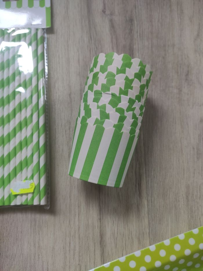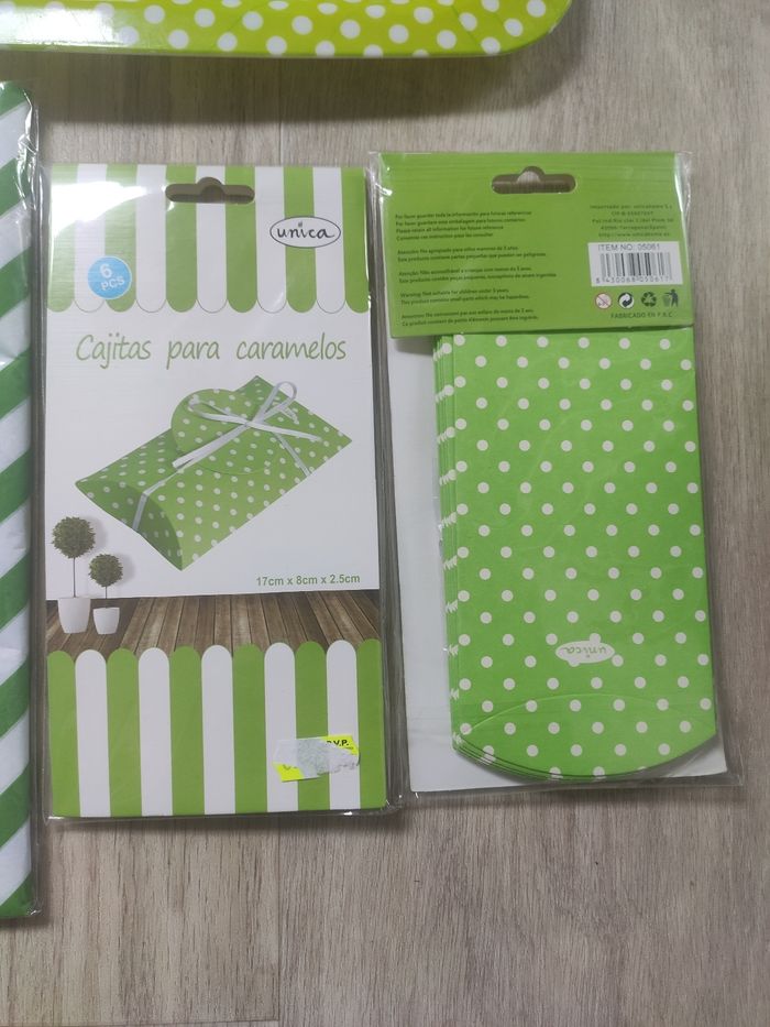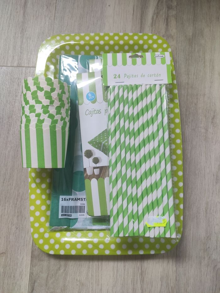 Un plateau de présentation vert à pois blancs en mélaminé 32,7 x 20,9 cm, 12 petites boîtes cadeaux en carton ,17 x 8 x 2,5 cm, 24 pailles en carton, 12 petits pots rayé vert et blanc et des feuilles cadeaux dans des gammes de verre et blanc. Le tout pour une décoration festive ! Le tout est neuf bien sûr