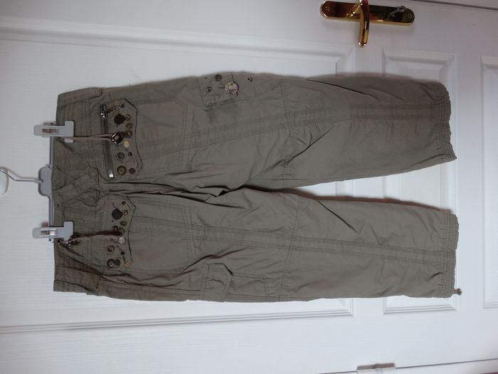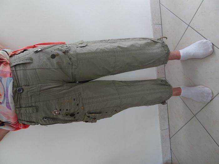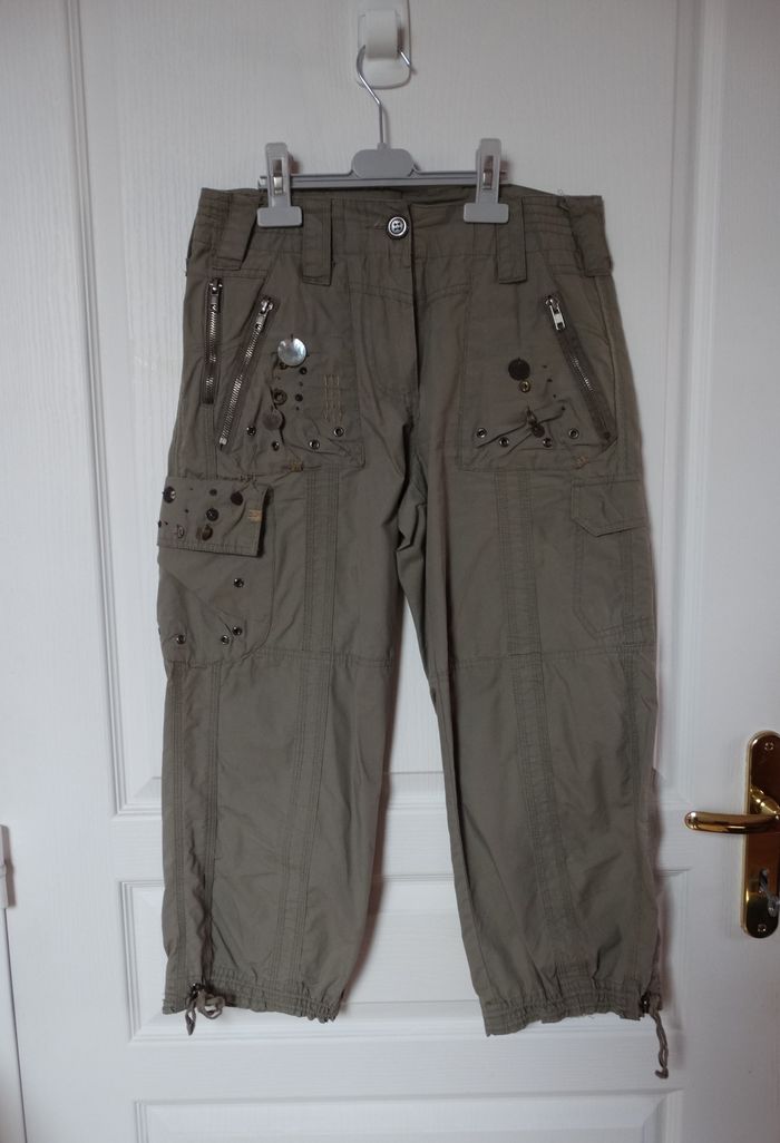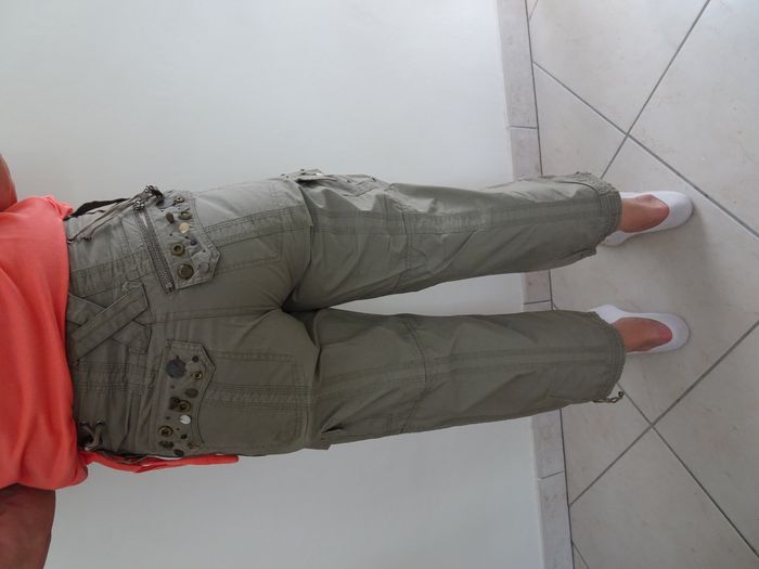 Pantalon court 7/8 ème vert kaki, taille 36 / S, avec des strass et perles, ficelle pour resserrer en bas.