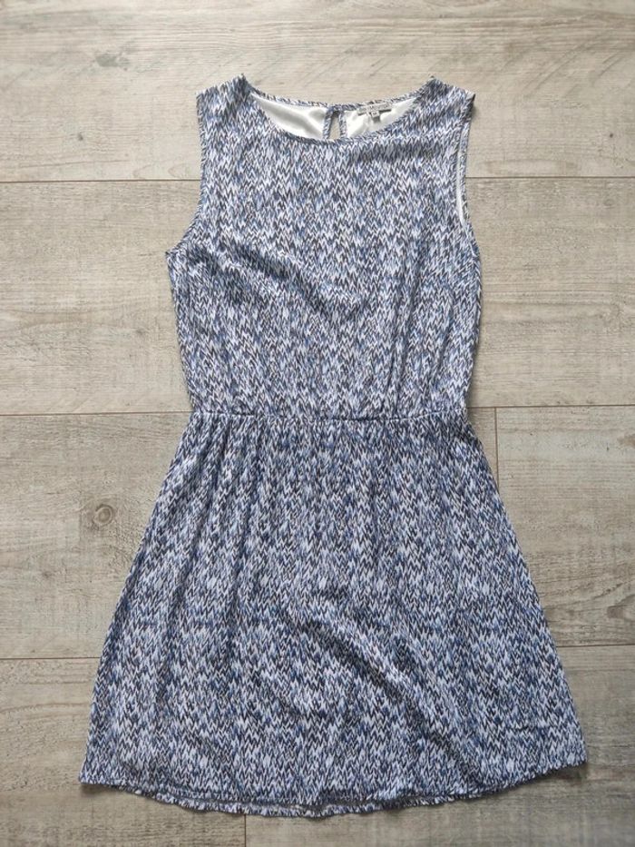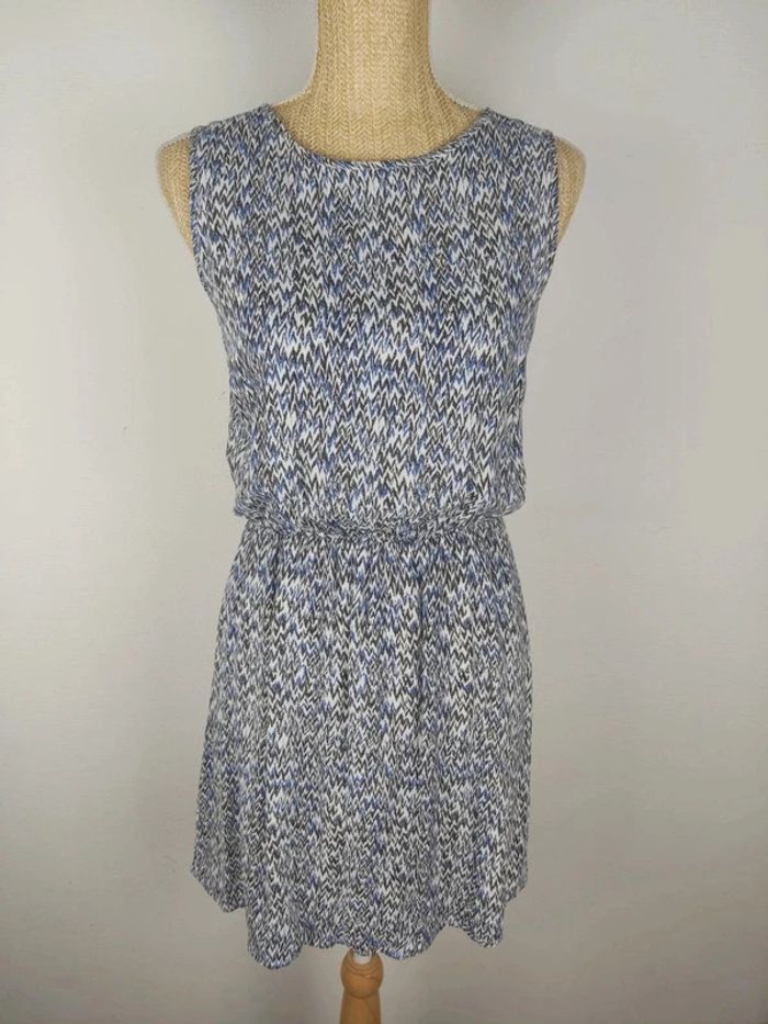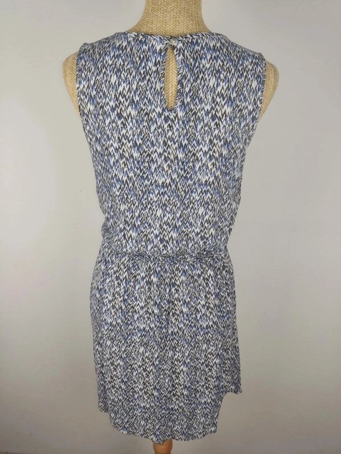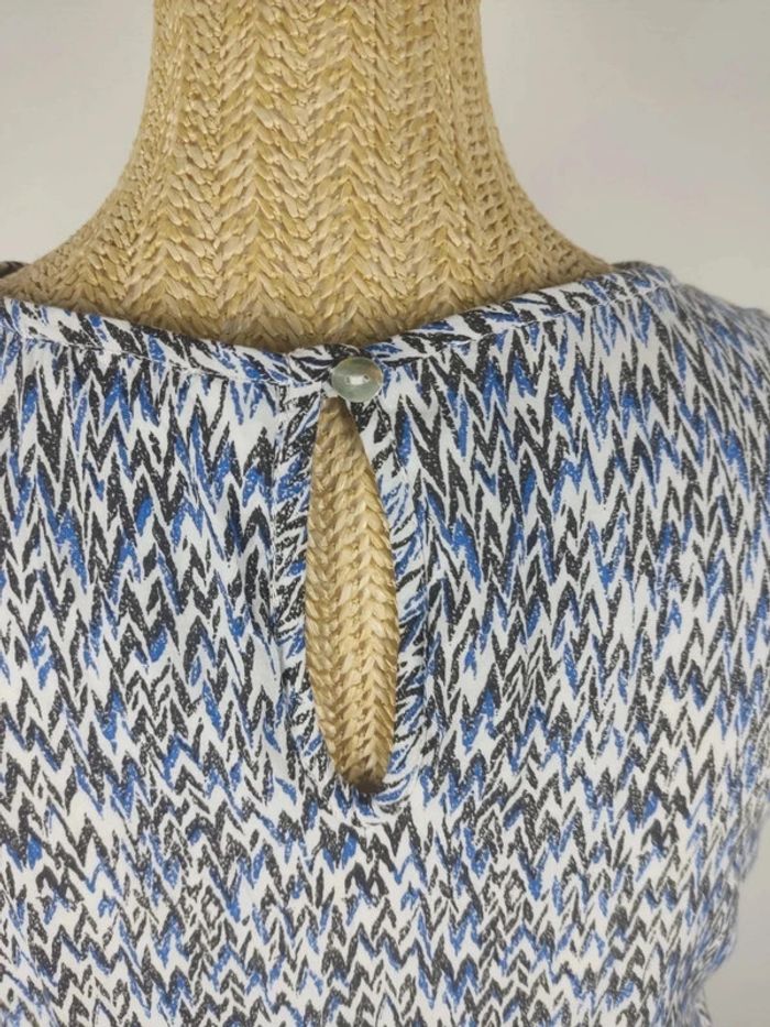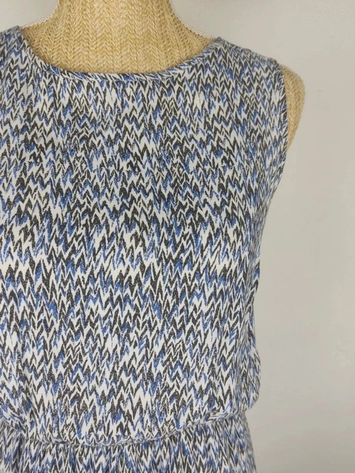 Robe mi-longue sans manches et col rond, bouton au col au dos, taille élastique, doublure stretch satinée blanc crème, couleur blanche aux motifs graphiques noirs et bleus, viscose / polyester, de la marque BEST MOUNTAIN.