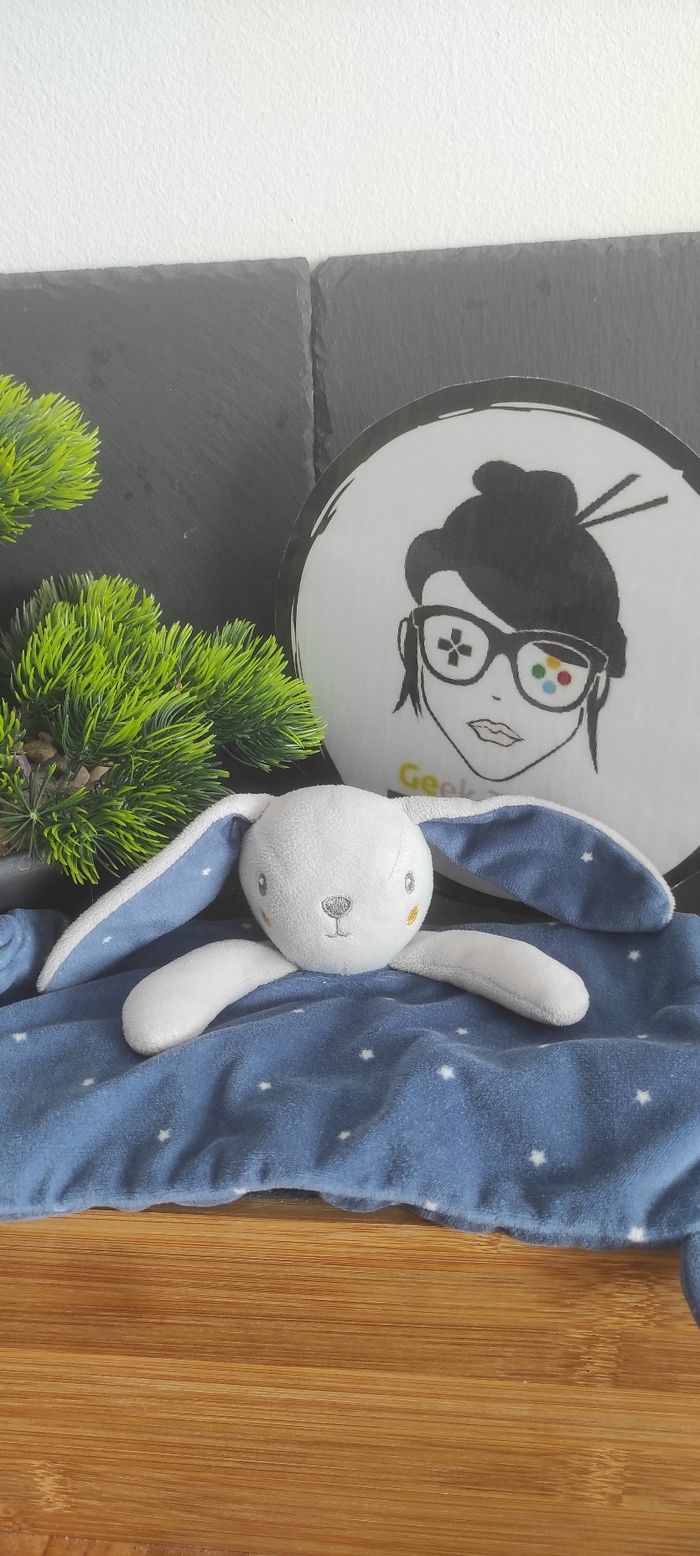Doudou plat lapin bleu nuit étoiles gris simba toys nicotoy jaune rond joue Plat