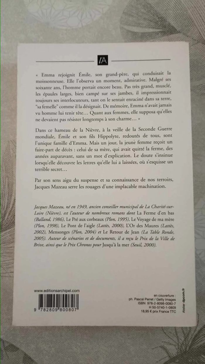 vends livre broché La ferme de l'enfer série Le Domaine des Quatre-Vents tome 1 sur 4 Jacques Mazeau Résumé : Dans ce hameau de la Nièvre, à la veille de la Seconde Guerre mondiale, Émile et son fils Hippolyte, redoutés de tous, sont l'unique famille d'Emma. Mais un jour, la jeune femme reçoit un faire-part de décès : celui de sa mère, qui avait quitté la ferme, des années auparavant, sans un mot d'explication. Le doute s'insinue lorsqu'elle découvre les lettres qu'elle lui a laissées, où s'esquisse un terrible secret... Par son sens aigu du suspense et sa connaissance de nos terroirs, Jacques Mazeau serre les rouages d'une implacable machination. bon état général #sylvaine88livres #roman #broche #régional #suspense #thriller #fille #secrets #ferme #vengeance #haine #bourgogne #famille #terroir N'hésitez pas à regarder l'ensemble de mon dressing je fais -20% sur les lots