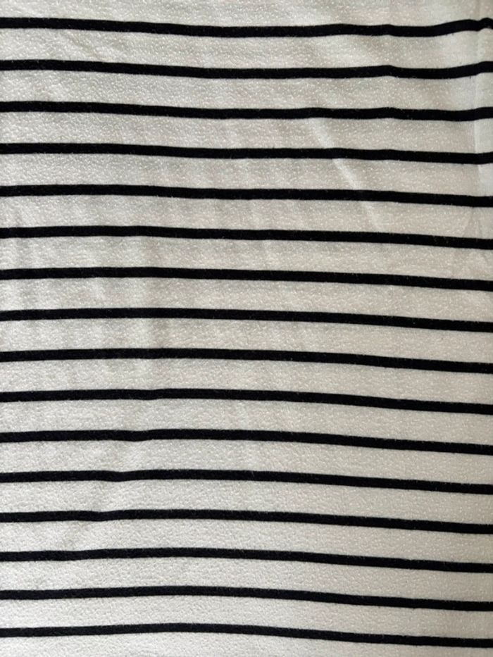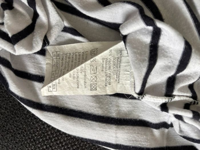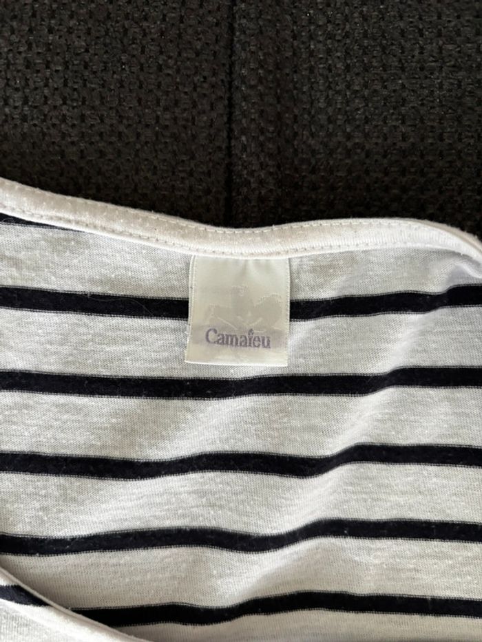 Haut marinière Manches courtes effet un peu bouffant et boutons sur les épaules Taille: M Marque: Camaïeu Présence de bouloches mais pas de trou ni tache