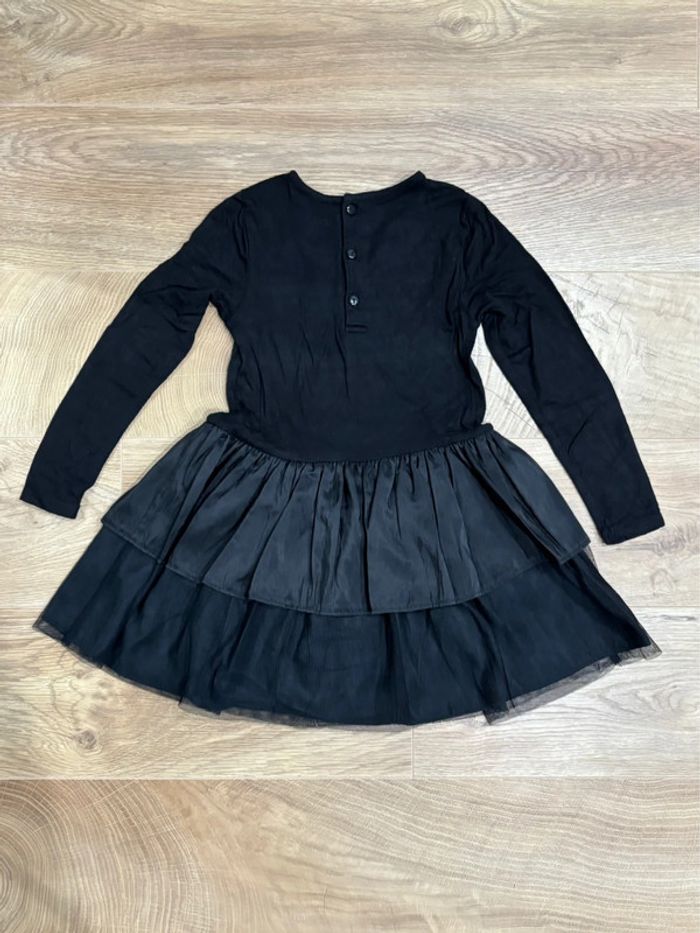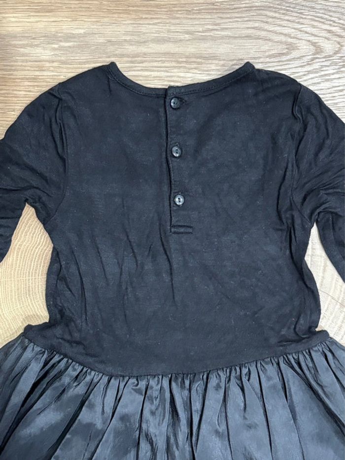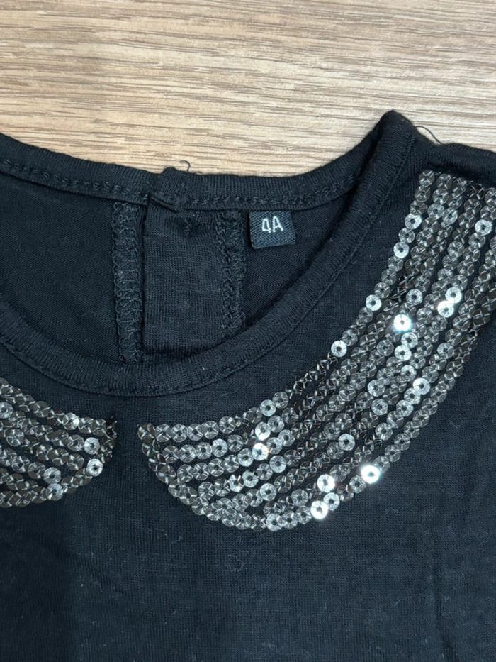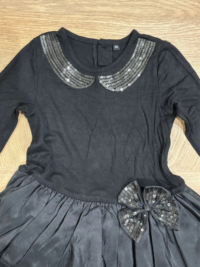 Robe noire manches longues Effet col claudine avec sequins brillants Gros noeud avec sequins brillants à la taille Volants sur la jupe avec jeu de matières (satinée, tulle) pour donner du volume Boutons au dos Taille: 4ans