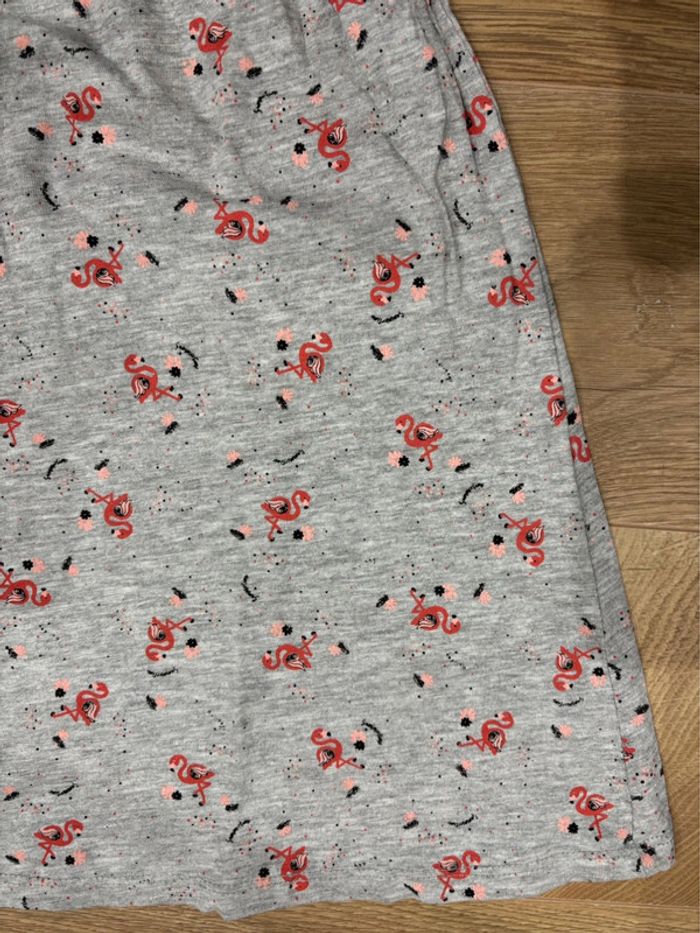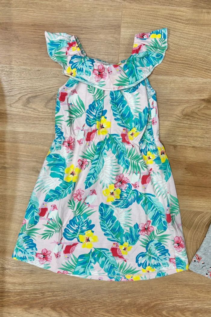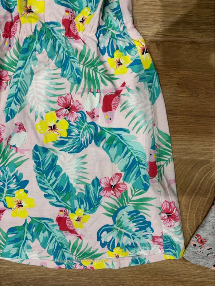 Lot de deux robes: - Une rose clair avec motifs fleurs et oiseaux tropicaux Taille: 4/6ans - 110/116cm Marque: H&M - Une grise claire motifs flamands roses Taille: 4 ans Marque: Inextenso Convient aux jumelles
