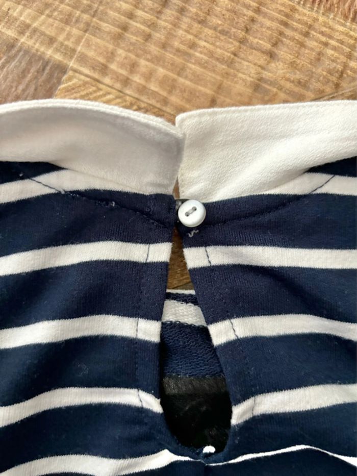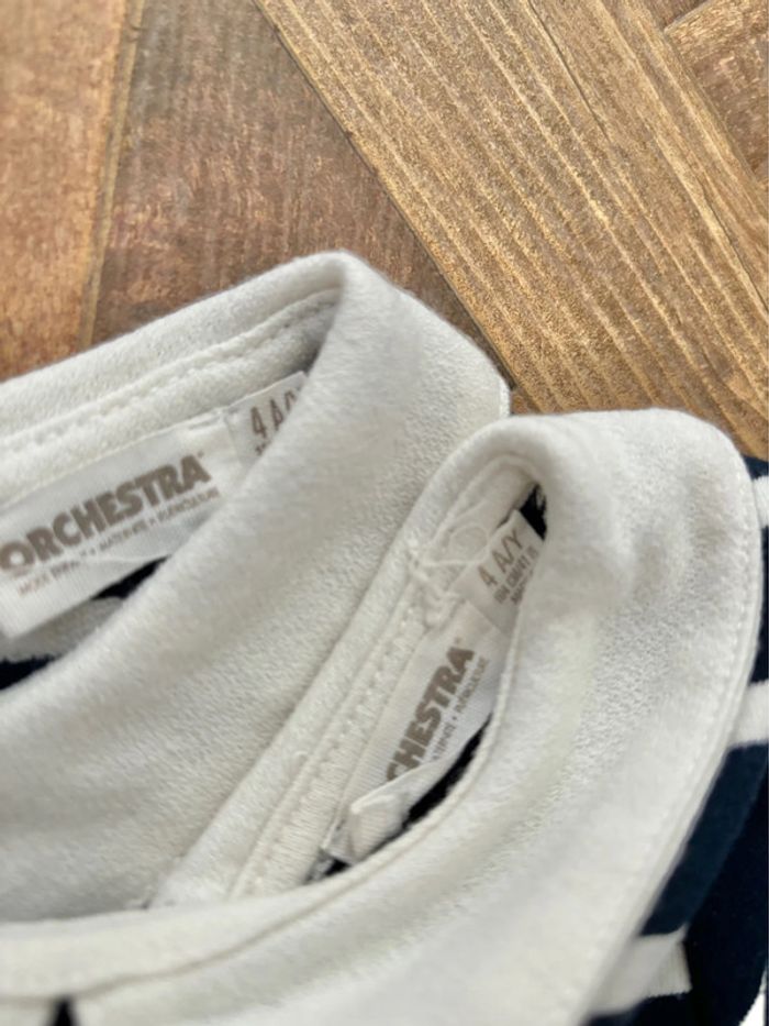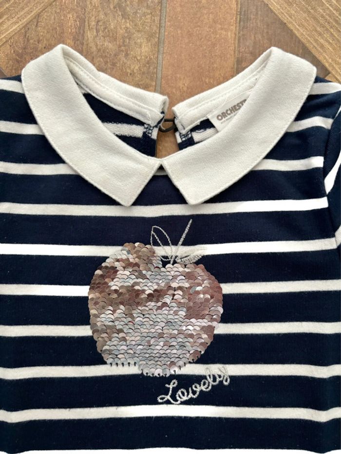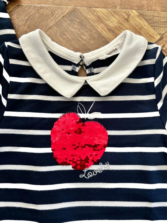 Lot de deux robes identiques Marinières rayées bleu marine et blanc Col claudine blanc Pomme en sequins magiques qui brillent (une face argentée et une face rouge) Broderie « Lovely » Un bouton au col au dos Taille: 4 ans Marque: Orchestra Très peu portées, en parfait état Idéal jumelles