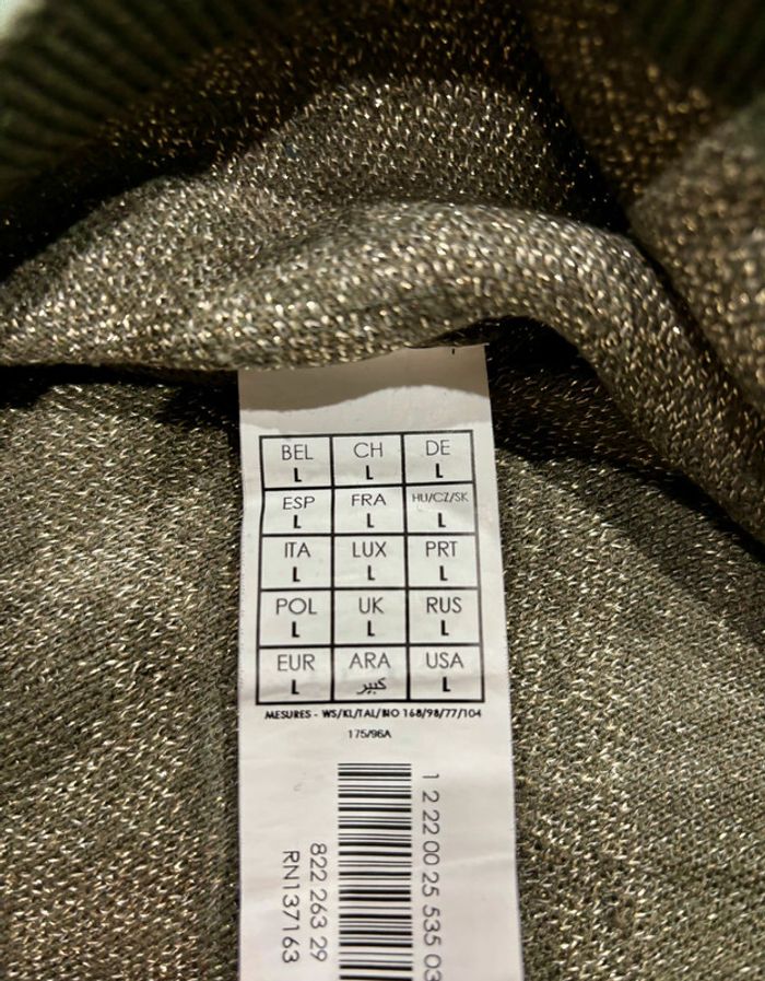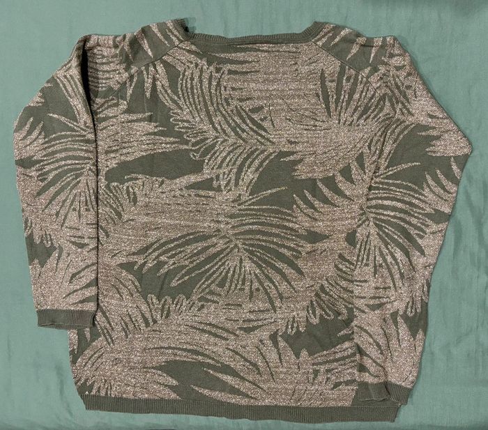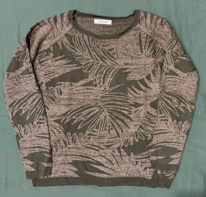 Pull fin couleur vert kaki avec motif feuilles en fil métallisé Taille: L correspond à 40/42 Marque: Promod