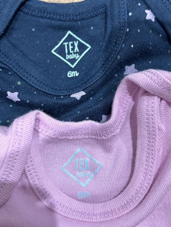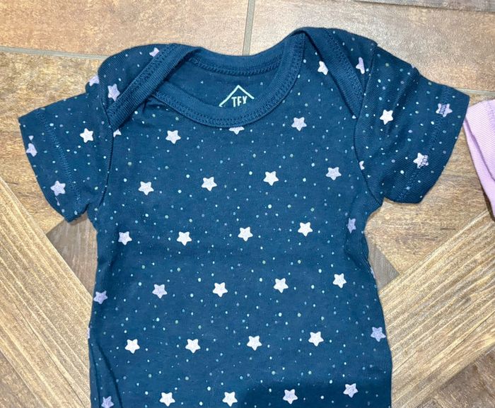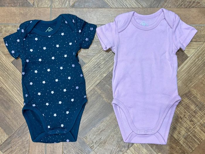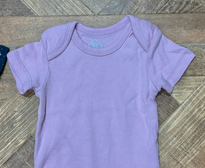 Lot de deux bodies manches courtes Un bleu marine avec imprimé points et étoiles mauves Un mauve Taille: 6 mois Marque: Tex Baby En parfait état