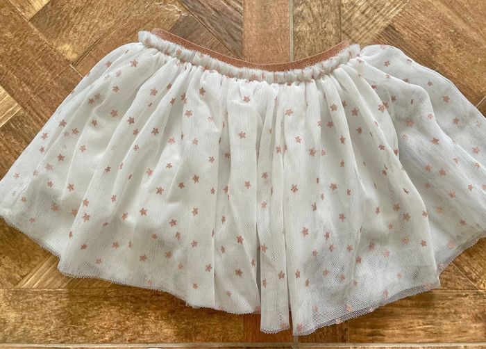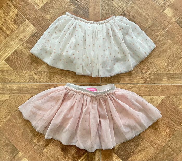 Lot de deux jupes en tulle avec étoiles pailletées assorties pour jumelles Une blanche avec étoiles rose gold Une rose avec étoiles argentées Taille: 9/12mois - 80cm Marque: Young Dimension Idéal jumelles