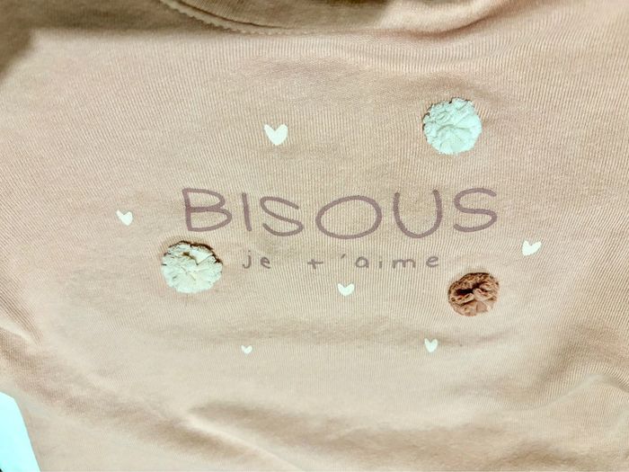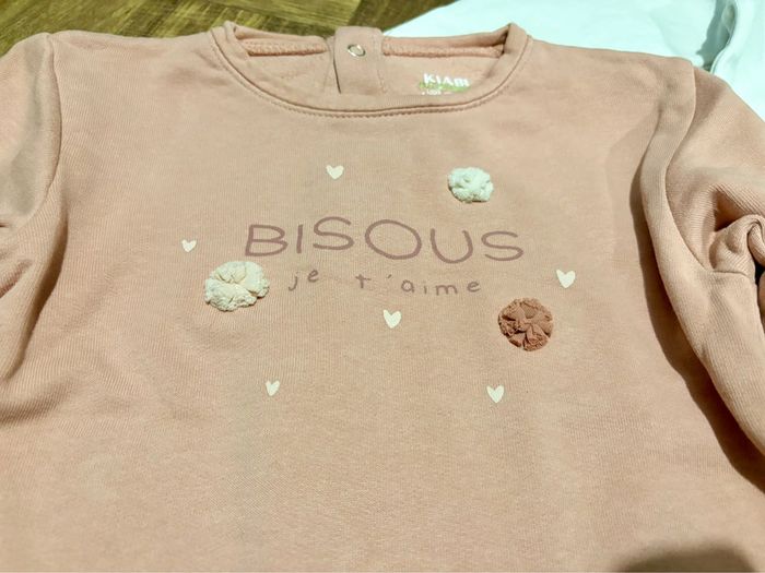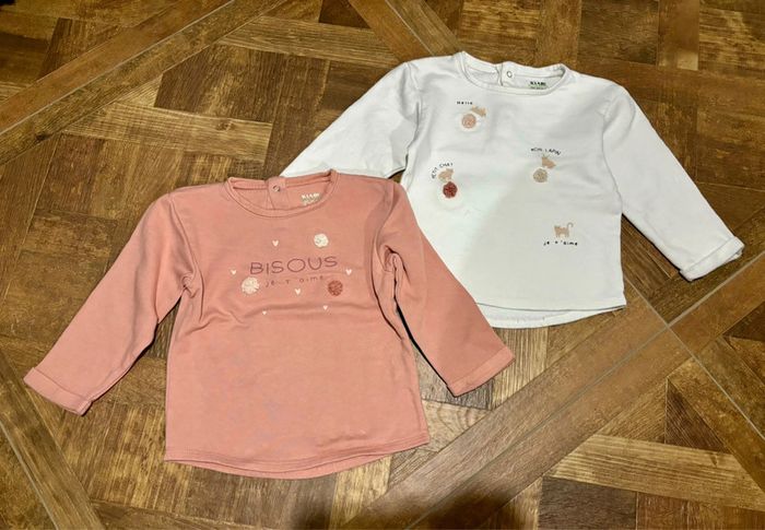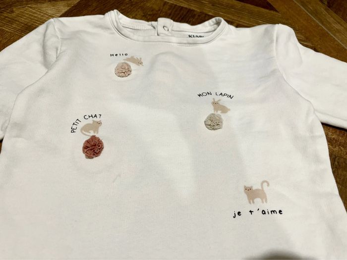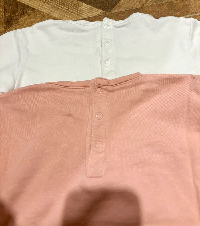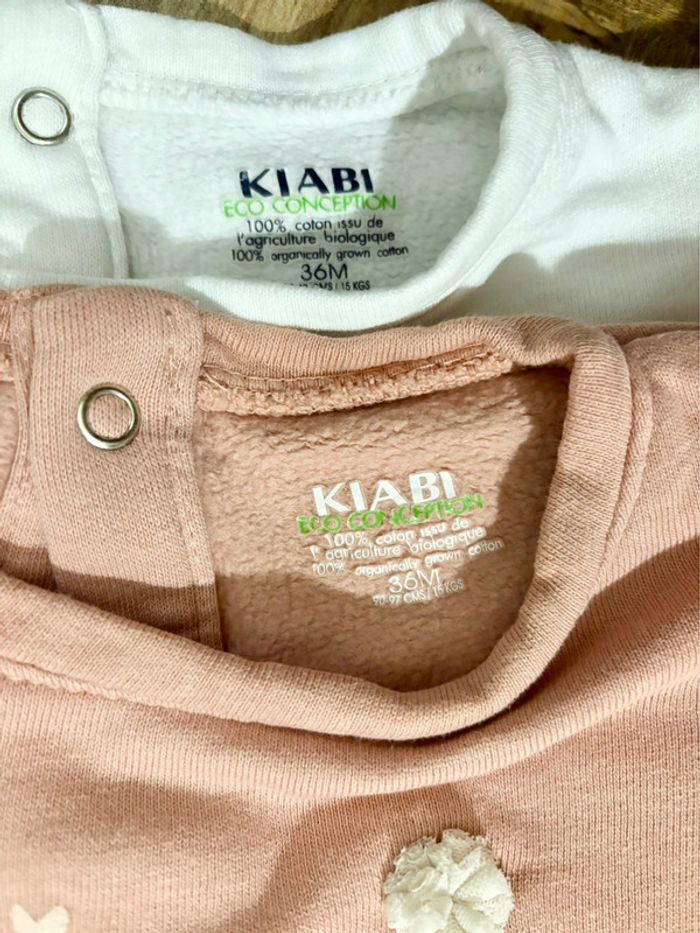 Un pull blanc et un vieux rose Détails pompoms en reliefs Pressions au dos Revers aux manches En coton biologique Taille: 36 mois - 3 ans Marque: Kiabi Quasiment pas portés, en parfait état sauf une petite tâche sur le blanc (cf photos) Convient aux jumelles