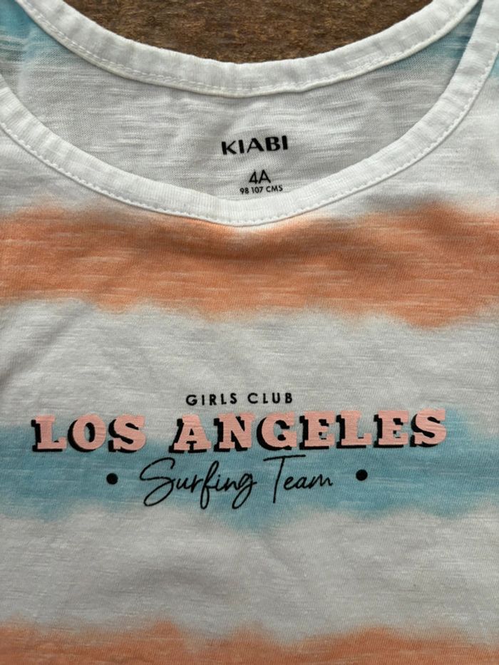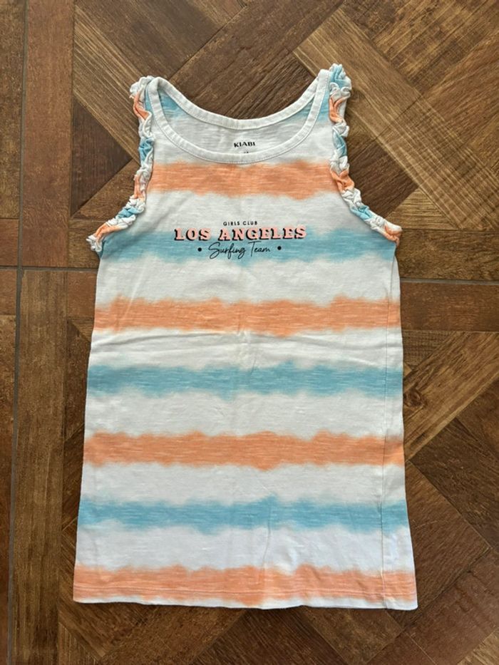 Robe sans manches blanche avec rayures effet tie and die bleu clair et orange saumon Taille: 4 ans Marque: Kiabi Parfait état (Je ne crois pas que mes filles l’ai portée une seule fois!)