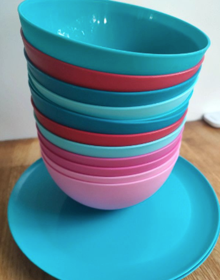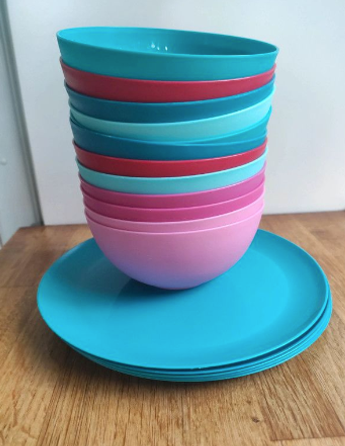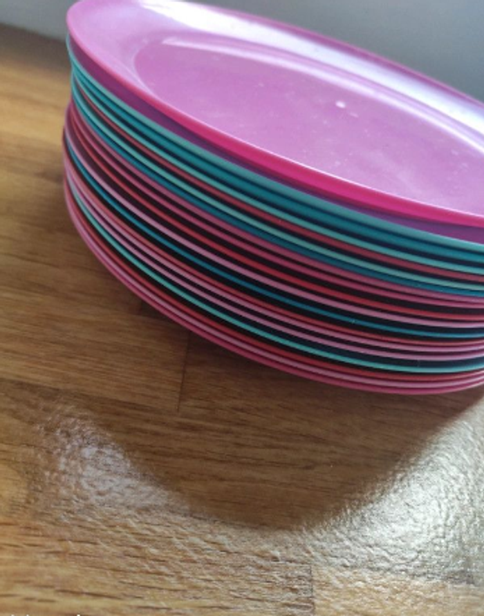 En plastique solide. Assiettes diamètre 20,9 cm. Bols diamètre 12,9 cm. Achetés chez Hema. 4 coloris différents. Idéal pour les gouters d'anniversaire ou les pique-niques. Le plastique est vraiment solide il peut tomber rien ne casse ! Très bon état