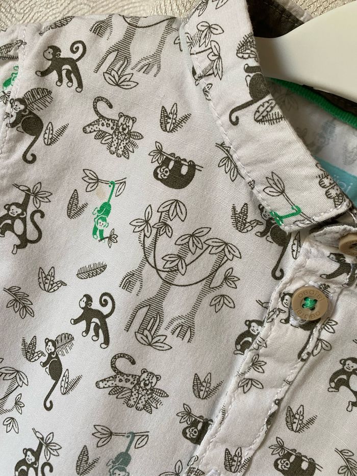 Jolie petite chemise manches courtes 100% coton blanche imprimée jungle gris et vert singe et panthère Taille 12 mois 74 cm Obaibi