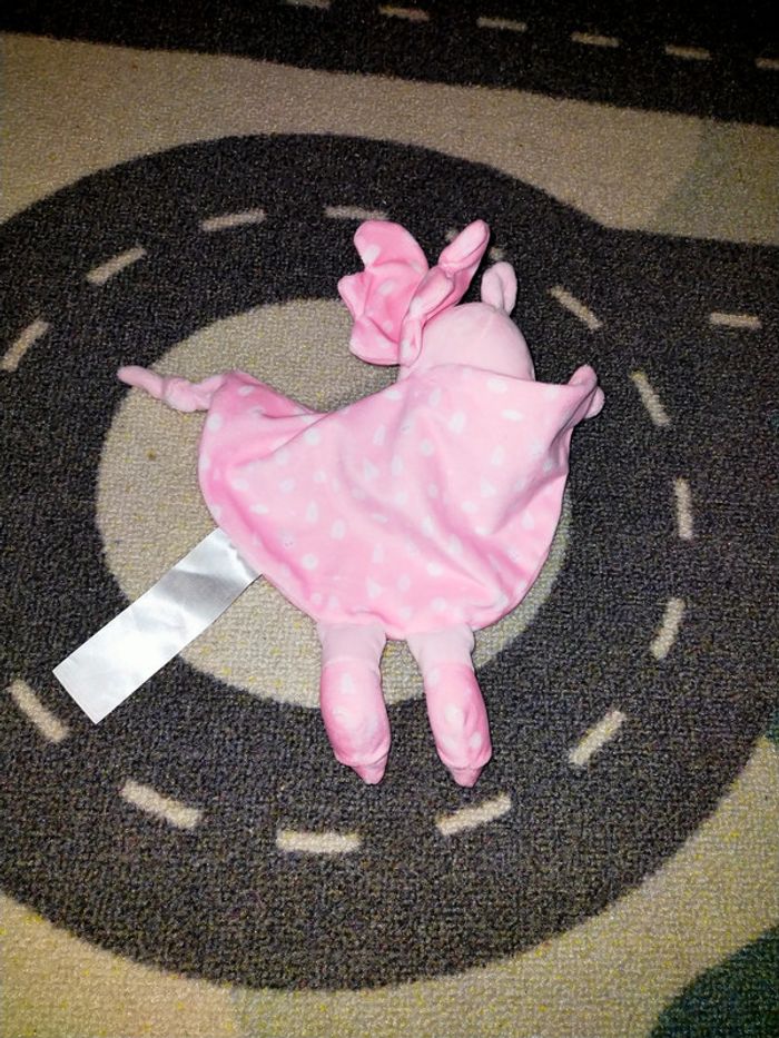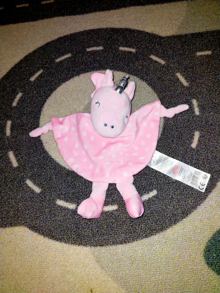 Doudou plat LICORNE rose avec petits motifs blancs corne argentée et petites ailes au dos grelot Tom & Kiddy bisous d'ange #plaisirdoffrir #lot #petitprix #doudoulicorne #tom&kiddy #bisousdange #doudougrelot