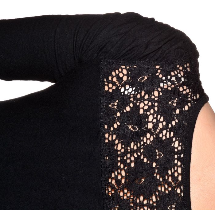 tshirt manches 3/4 noir uni fronces aux épaules, dos dentelle taille S ajusté col rond - photo numéro 2