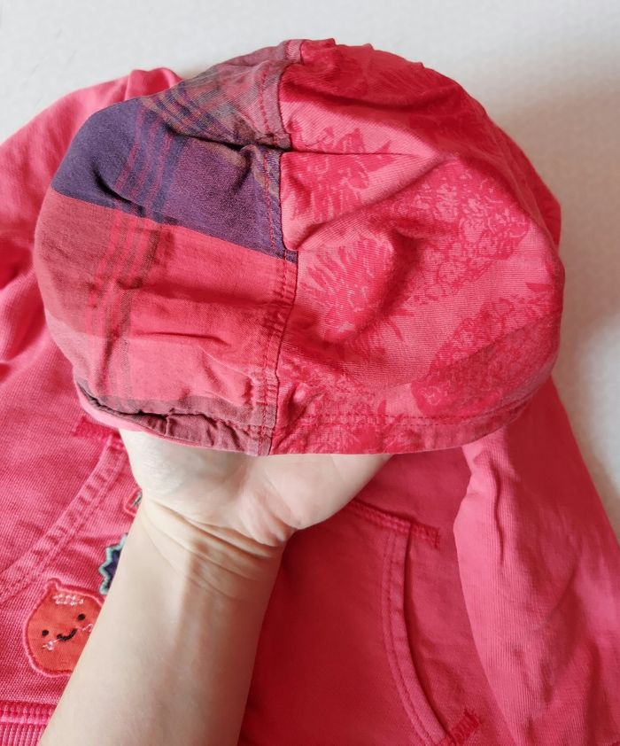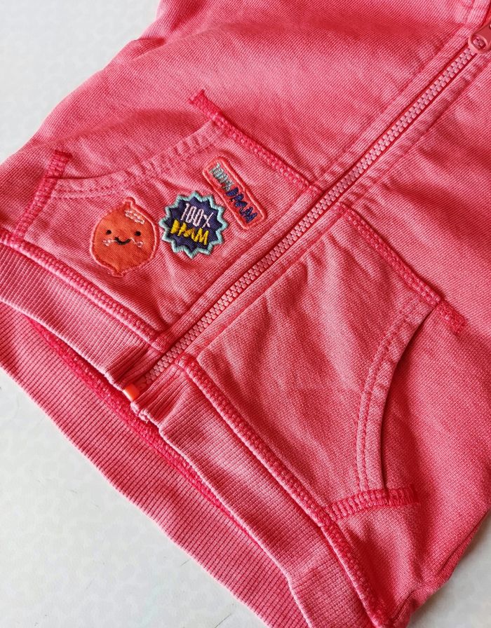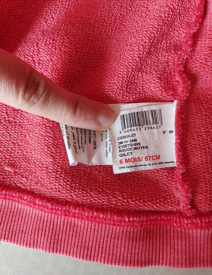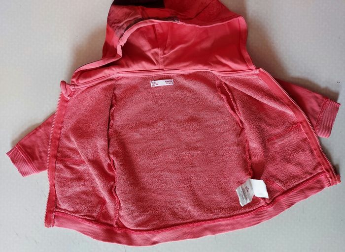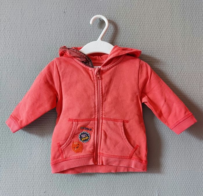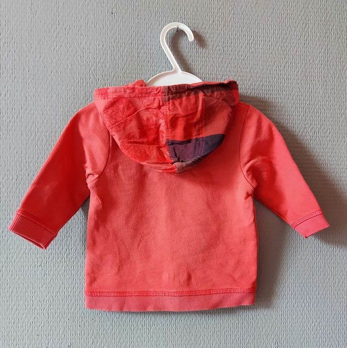 Je vends un sweat à capuche de couleur rouge, possède 2 poches (détails sur une des deux), détails sur la capuche et dispositif anti pincement à la tirette au niveau du cou. De la marque Du Pareil.... au même , taille 6 mois (67 cm). Attention : légèrement décoloré. Utilisé mais en bon état malgré tout.