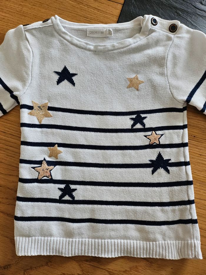 Pull fin blanc et bleu marine style marinière avec motifs étoiles marines ou dorées Orchestra 4 ans #jucan4ans