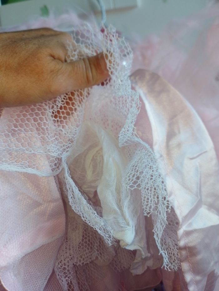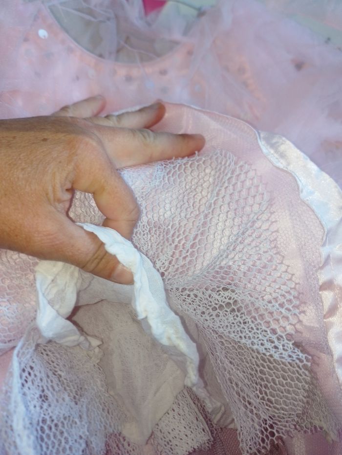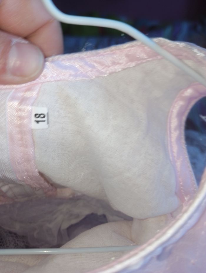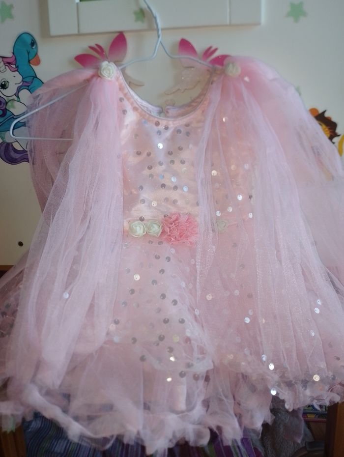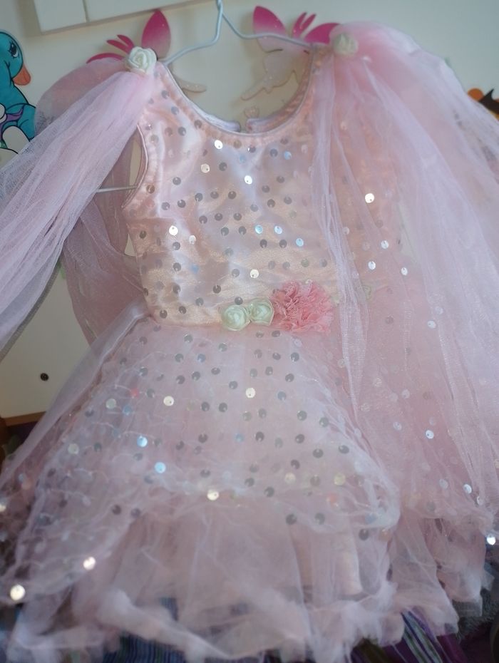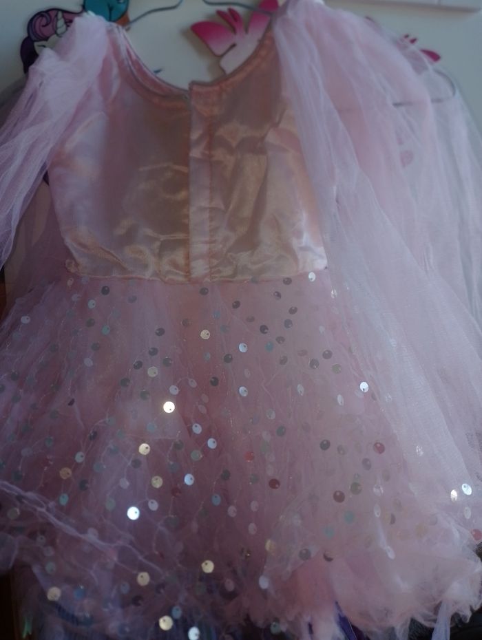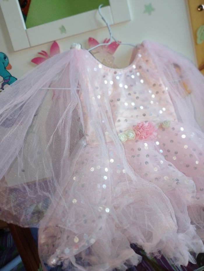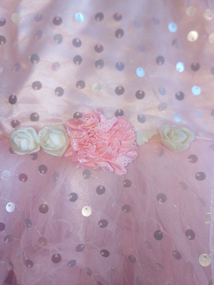 Tenue de cérémonie 18 mois Avec sequins 4 épaisseur Lien de serrage dans le dos Voile au niveau des épaules Manque 1 fleurs a la ceinture Possible d'en récupérer 1 au épaule et de modifier avec autre chose au épaule
