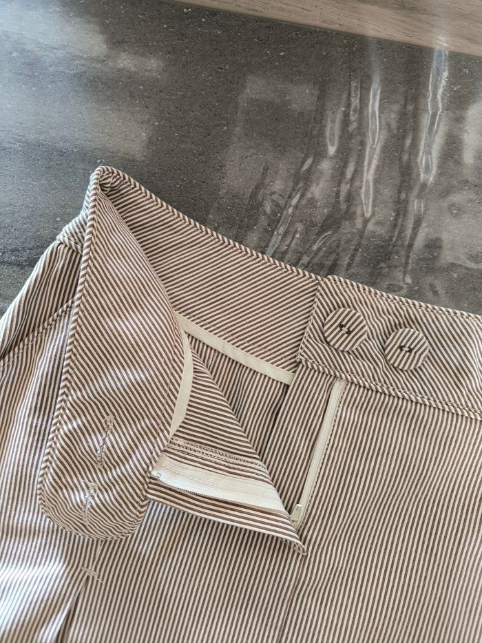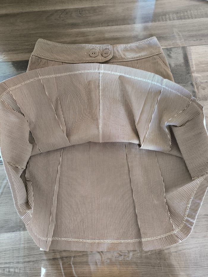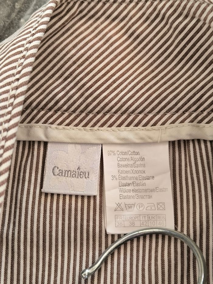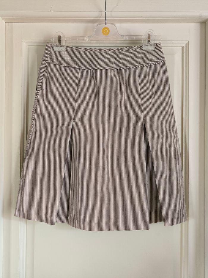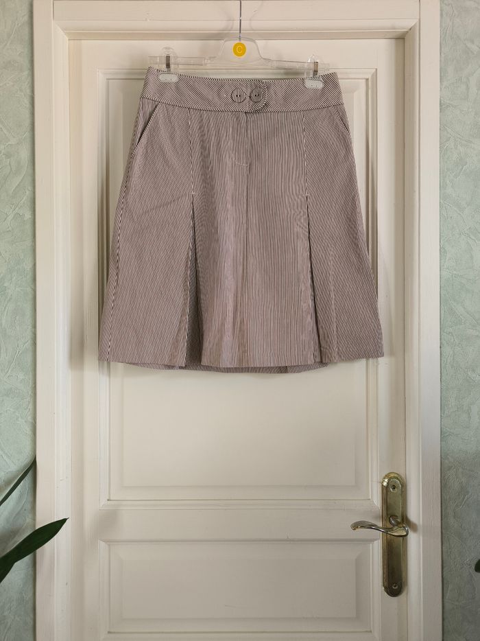 Jupe Marque Camaïeu Taille 38 • Coloris marron, crème • Rayures verticales • Fermeture par boutons • 2 poches • Effet plissé Largeur taille non étirée : 37 cm Largeur taille étirée au maximum : 40 Longueur totale : 57 cm Ensemble avec la veste disponible En très bon état #evelyne_taille_38