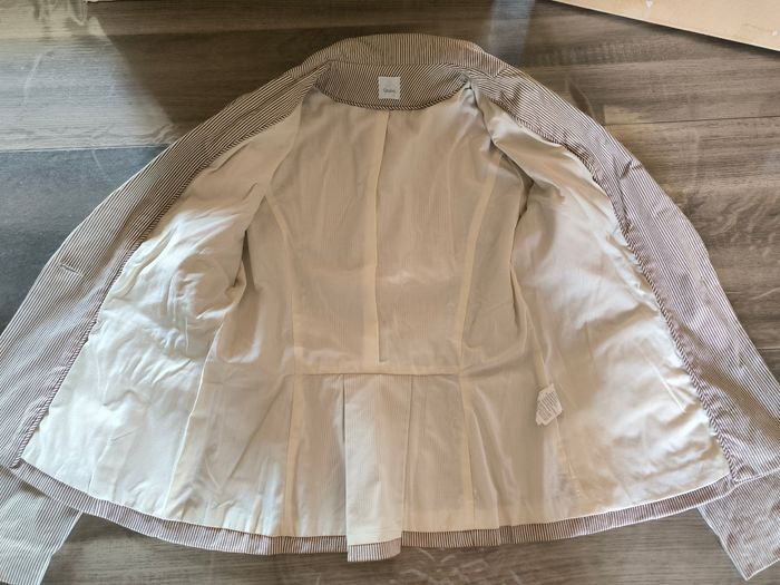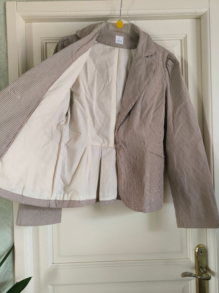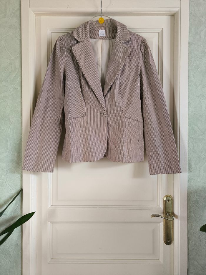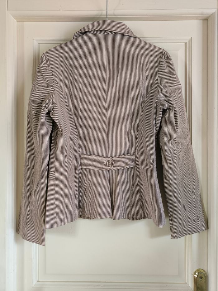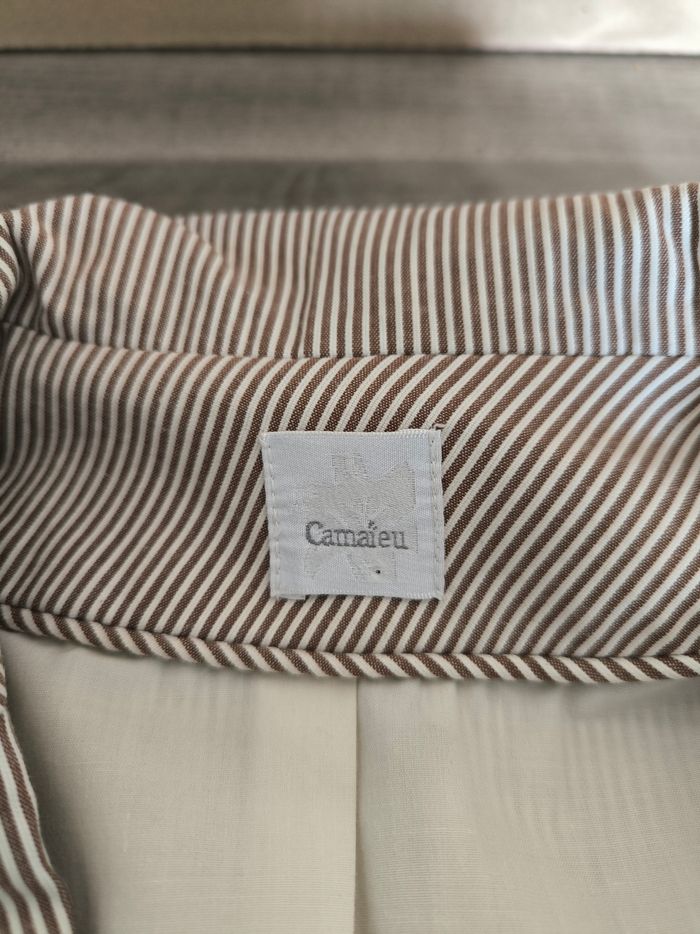 Veste/Blazer à manches longues Marque Camaïeu Taille 42 • Coloris marron, crème • Rayures verticales • Fermeture par bouton • 2 poches Largeur épaule à épaule non étirée : 39 cm Largeur épaule à épaule étirée au maximum : 42 cm Largeur aisselle à aisselle non étirée : 47 cm Largeur aisselle à aisselle étirée au maximum : 58 cm Longueur manche : 64 cm Longueur totale : 63 cm Longueur aisselle : 38 cm Ensemble avec la jupe disponible En très bon état #evelyne_taille_42