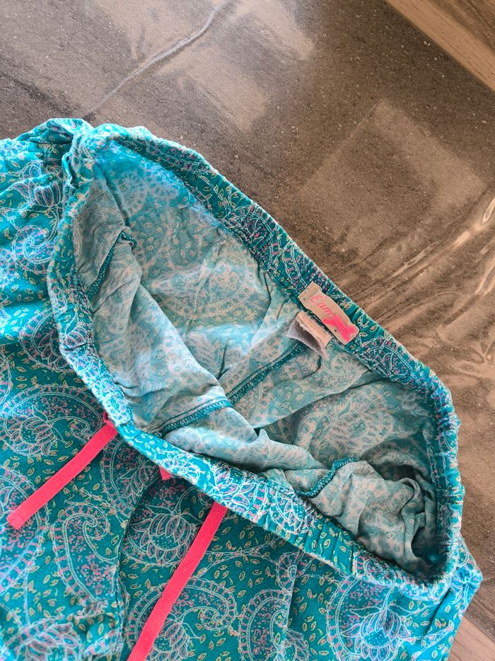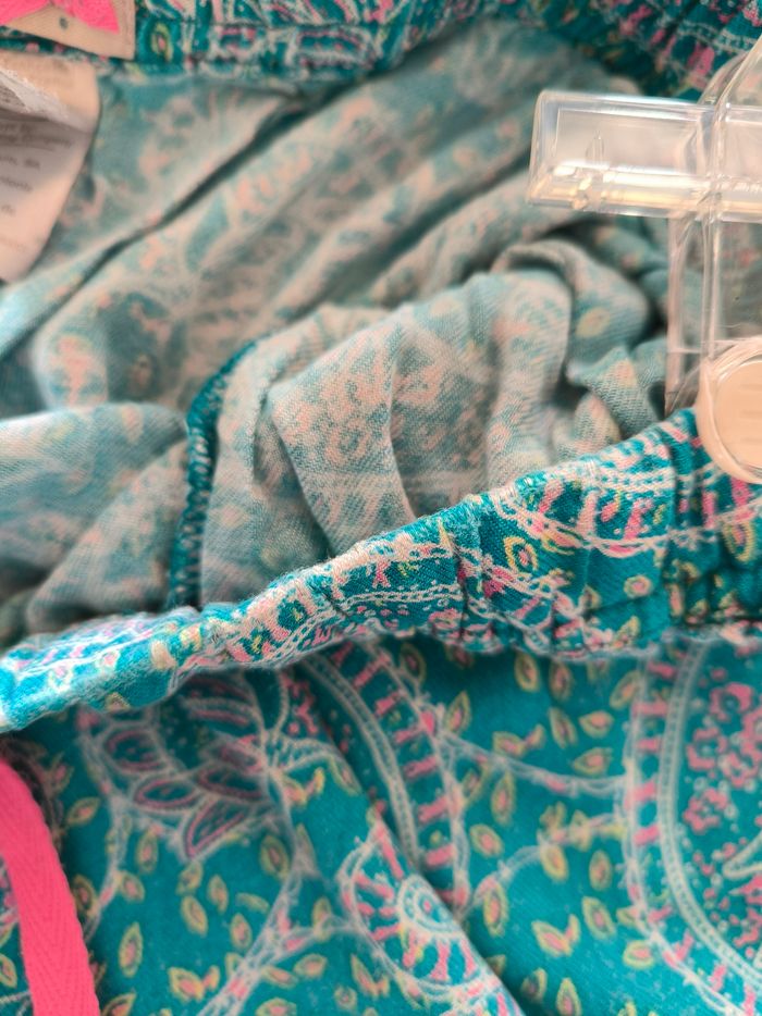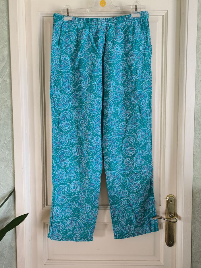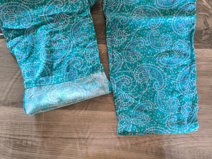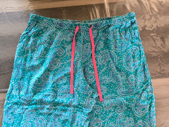 Pantalon de pyjama Marque Etam Taille L, 40 • Coloris bleu turquoise, rose, blanc, jaune • Imprimés cachemire • Taille élastique avec cordons • 2 poches • Tissu fin, fluide • Taille abîmée Largeur taille non étirée : 40 cm Largeur taille étirée au maximum : 54 cm Longueur totale : 97 cm Longueur entrejambe : 74 cm Largeur bas des jambes : 21 cm En bon état #evelyne_taille_40