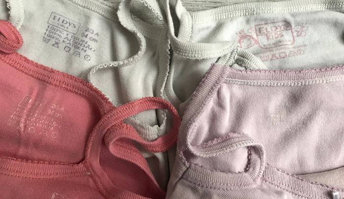 Lot de 4 maillots de corps de la marque Eldys Taille 2/3 ans Présence de tâches sur le mauve et les blancs et traces d’utilisation Occasion, état satisfaisant