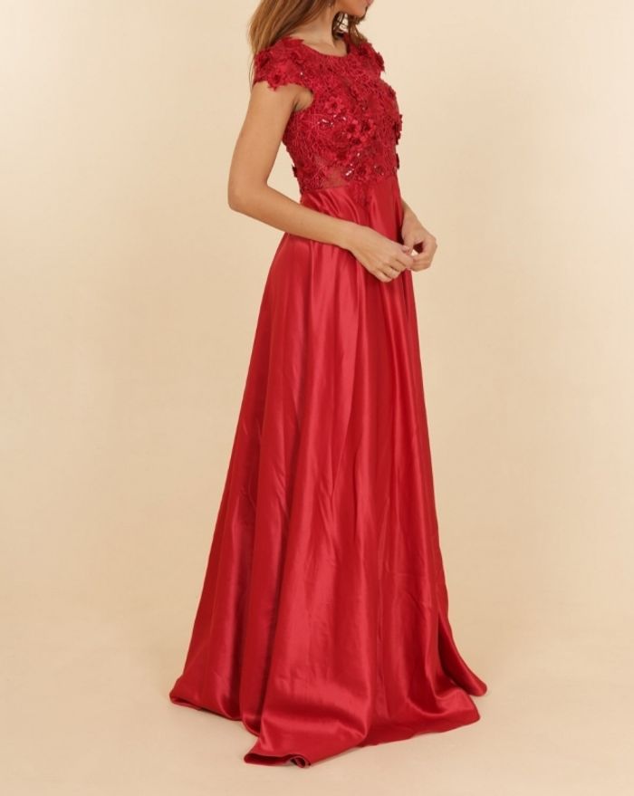 robe de soirée longue cintré à la taille et évasé dans le bas.  haut en dentelle et bas satiné  couleur bordeaux fermeture zippé au dos  coque en mousse au niveau de la poitrine pour un meilleur maintien. Taille 36
