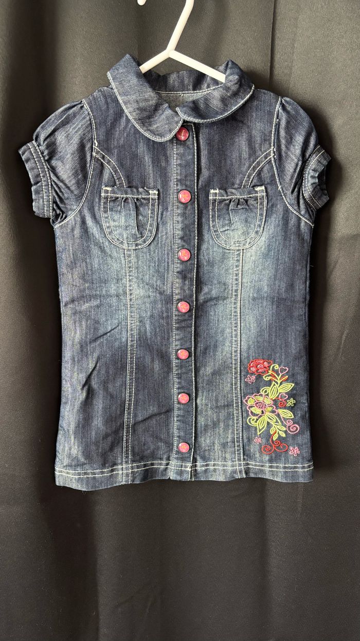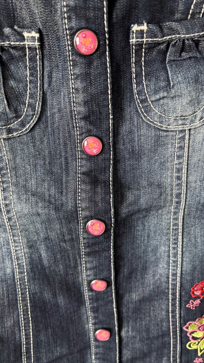 Joli robe en jean bleu foncé avec motif florale. Ouverture par bouton pression