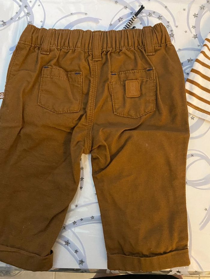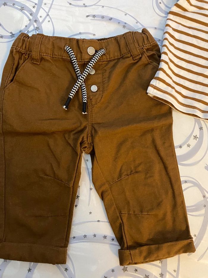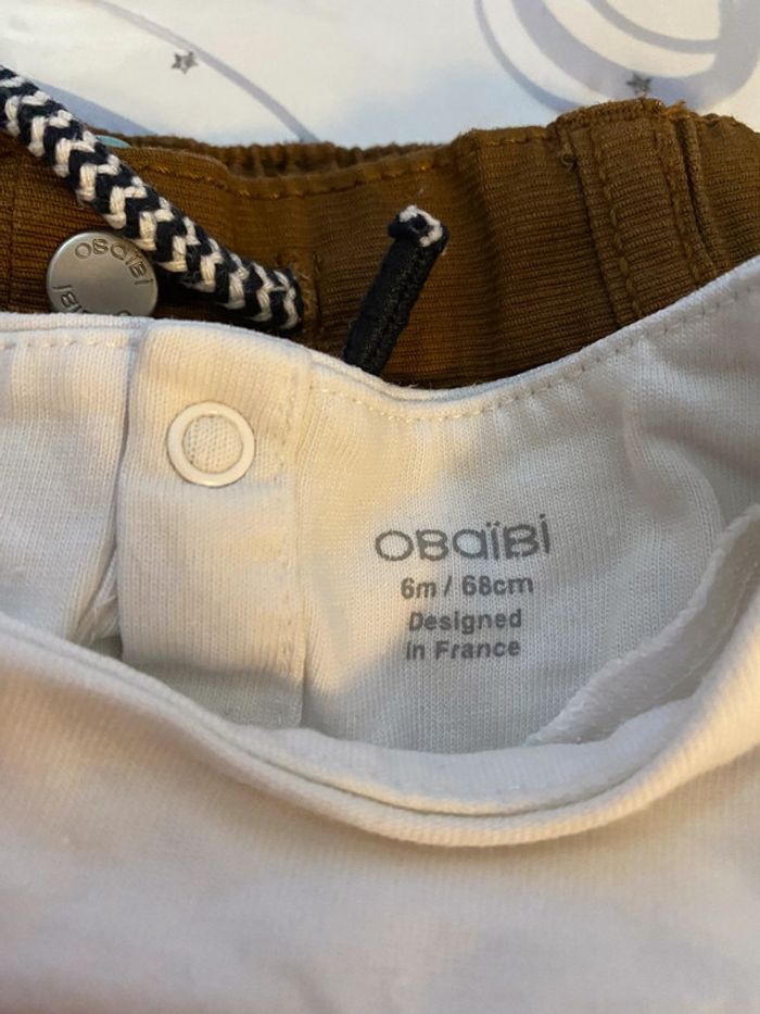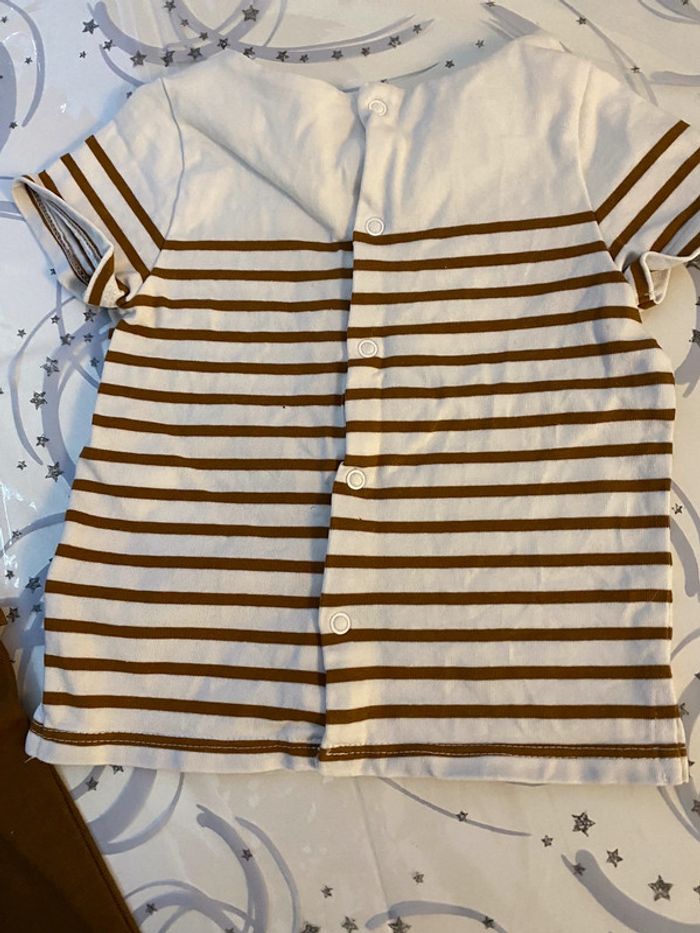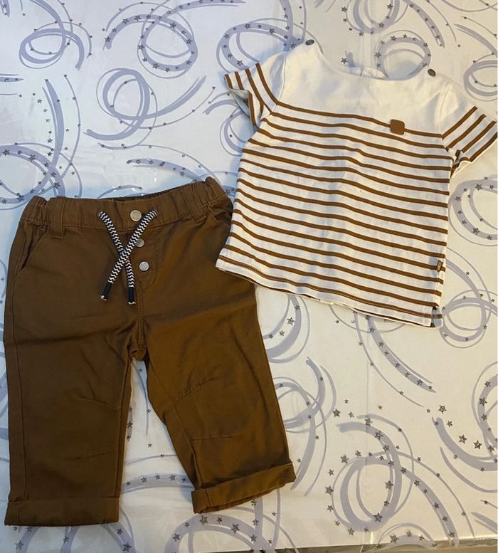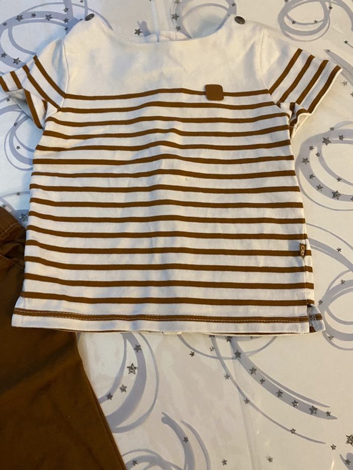 Ensemble de pantalon marron avec marinière accordée marron et blanca manches courtes de marque obaïbi en taille 6 mois en excellent état #amelie6moisbebegarcons #obaïbi