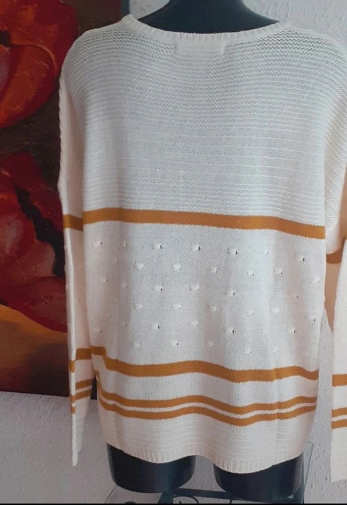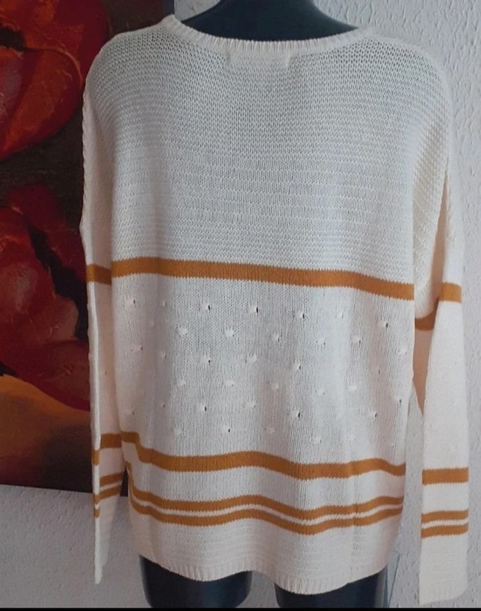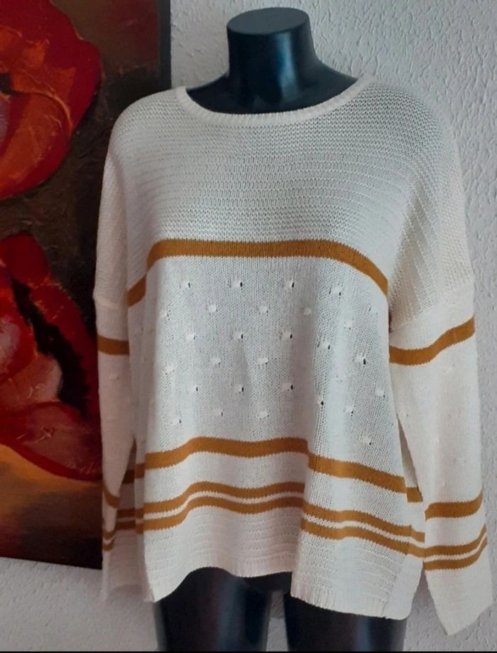 Col rond Coupe ultra confort aux épaules tombantes  Manches longues Jeux de points et de rayures contrastantes devant dos et manches Maille douceur Longueur : 62 cm env. Taille : 52 Prix : 13€ Neuf jamais porté #sisterkayafemmeT52 Ref : b.h +1