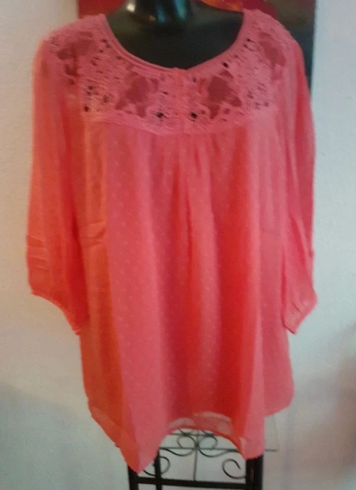 Blouse macramé unie, voile plumetis - Col rond avec fente boutonnée - Plastron encolure devant en macramé - Découpe arrondie froncée sous l'encolure devant - Découpe dos avec fronces - Fronces en tête de manches - Manches 3/4 amples, élastiquées à la base - Base droite évasée - Longueur 70 cm env. Composition : - Voile plumetis 100% polyester Taille : 52 Coloris : corail Prix : 10€ Neuve jamais portée #sisterkayafemmet52 Réf : à.fa +1