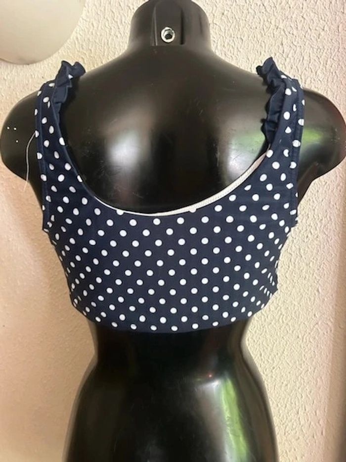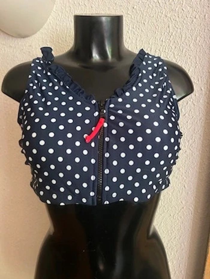 Haut de maillot Forme brassière avec doublure toute douce et coques moulées intégrées bien souples  Poches intégrées de chaque côté pour y insérer facilement vos prothèses en toute discrétion. Décolleté V bordé d'un volant uni devant et dans le haut du dos Couvre la poitrine à la perfection même allongée sur le ventre Entièrement zippé devant avec crochet à la base lichette contrastée et rabat intérieur : décolleté ajusté enfilage facile et aucun risque de blessure  Elastique souple sous poitrine pour assurer un joli galbe et le maintien des prothèses. Sèche rapidement Matière UV 50 conçue pour protéger activement la peau des rayons du soleil. Composition : 80% polyamide 20% élasthanne protection UV 50 • Doublure 90% polyester 10% élasthanne. Taille : 100C Coloris : marine Prix : 8€ Neuf jamais porté #sisterkayasvfemme100C #sisterkayamaillotdebain #sisterkayapostoperatoire Réf : à.ei +1