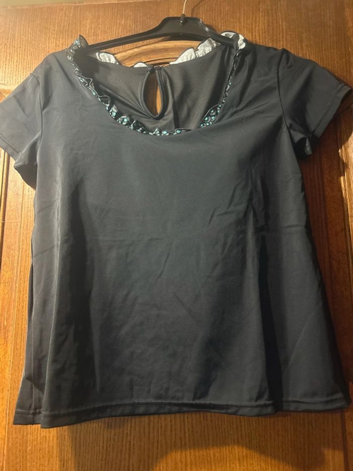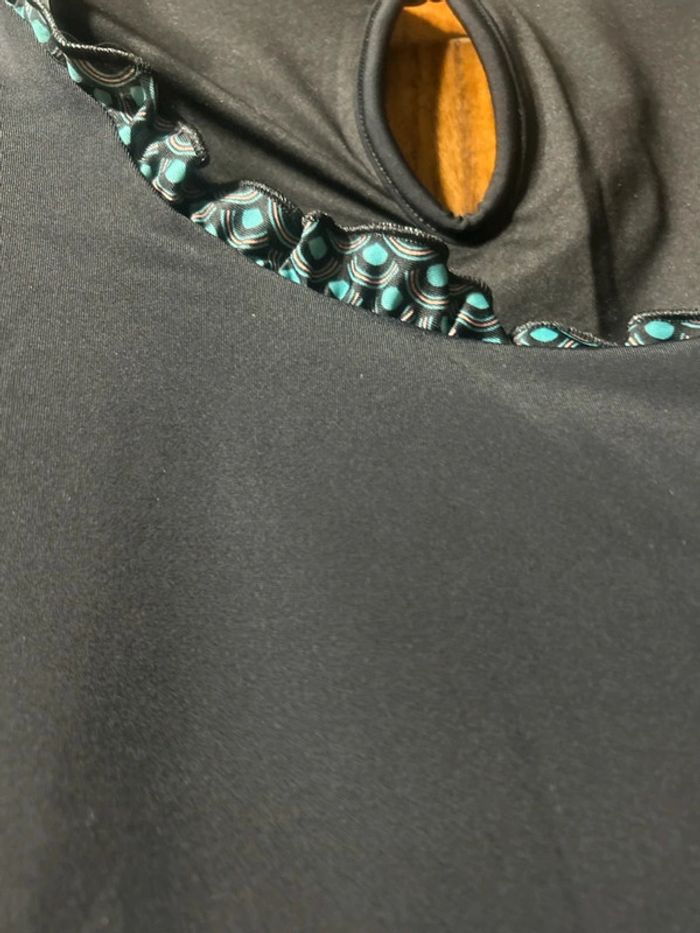 Haut de tankini manches courtes post-opératoire Matière UV 50 conçue pour protéger activement la peau du soleil Col rond bordé d'un petit volant imprimé "Pois" devant pour un look ultra féminin Petites manches non serrantes avec emmanchures confort pour un enfilage facile  Brassière intégrée avec coques moulées bien souples  Poches intégrées à la brassière pour insérer facilement vos prothèses en toute discrétion  Elastique souple intérieur pour assurer un joli galbe et le maintien des prothèses. Doublure très douce qui protége les cicatrices. Joli volume fluide et flatteur  Composition : 80% polyamide 20% élasthanne protection UV 50 Doublure 100% polyester Taille : 38 Coloris : noir Prix : 13€ Neuf jamais porté #sisterkayafemmet38 #sisterkayamaillotdebain #sisterkayapostoperatoire Réf : b.ii +1