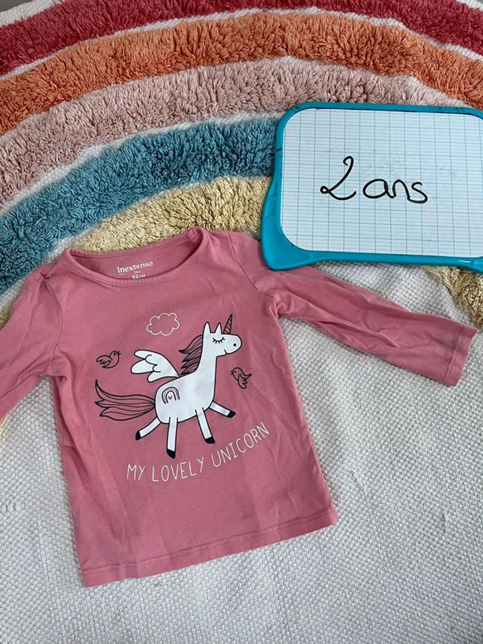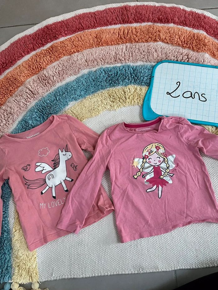 #dressing_fille2ans_oreelii Lot de t-shirt manches longues 2ans. Celui avec la fée est comme neuf, celui avec la licorne à des taches d’encre sur la bas d’une manche et dans le dos (il a servi pour les activités à la crèche)