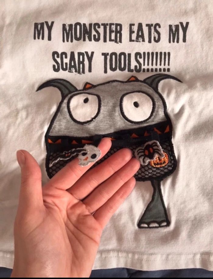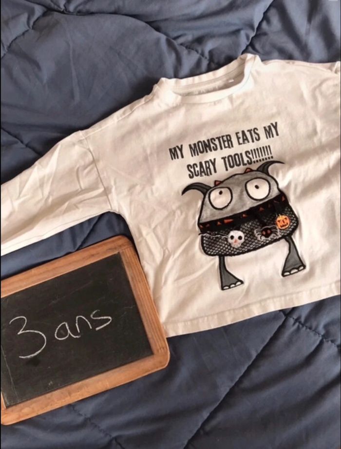 t-shirt manches longues avec petits monstres : chauve-souris araignée tête de mort et citrouille. En parfait état, juste porté 1 fois. Taille 3ans #dressing_garcon3ans_oreelii