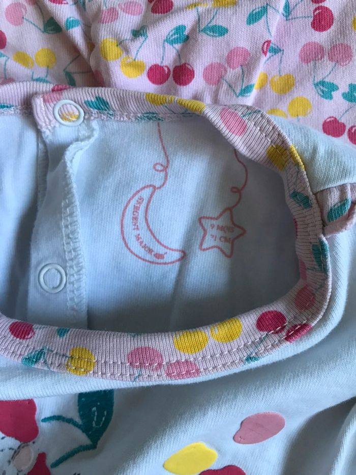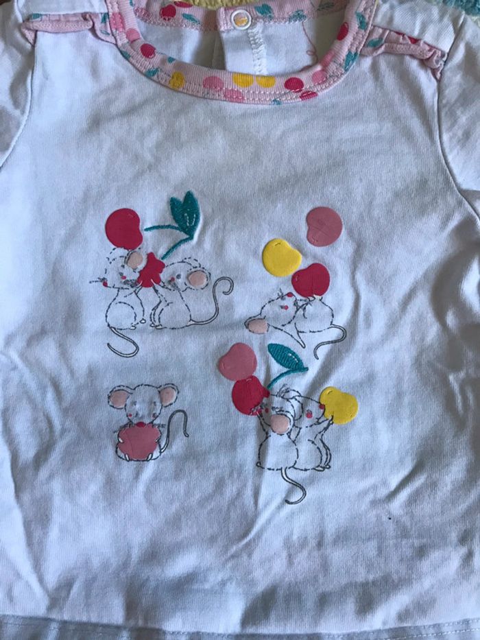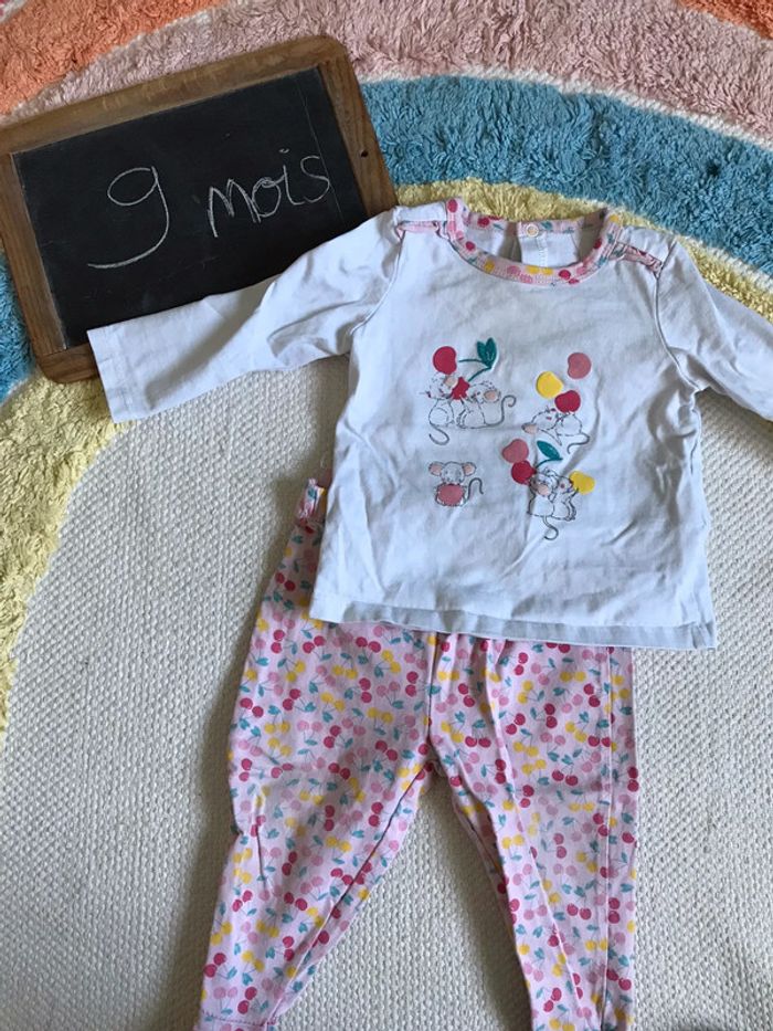 #dressing_fille9mois_oreelii Pyjama 2 pièces pouvant être attaché à l’aide d’un élastique situé dans le pantalon. Motif petites souris et cerises. Très peu porté car pas la bonne saison. Taille 9 mois marque sergent major