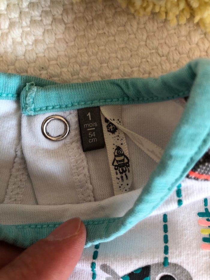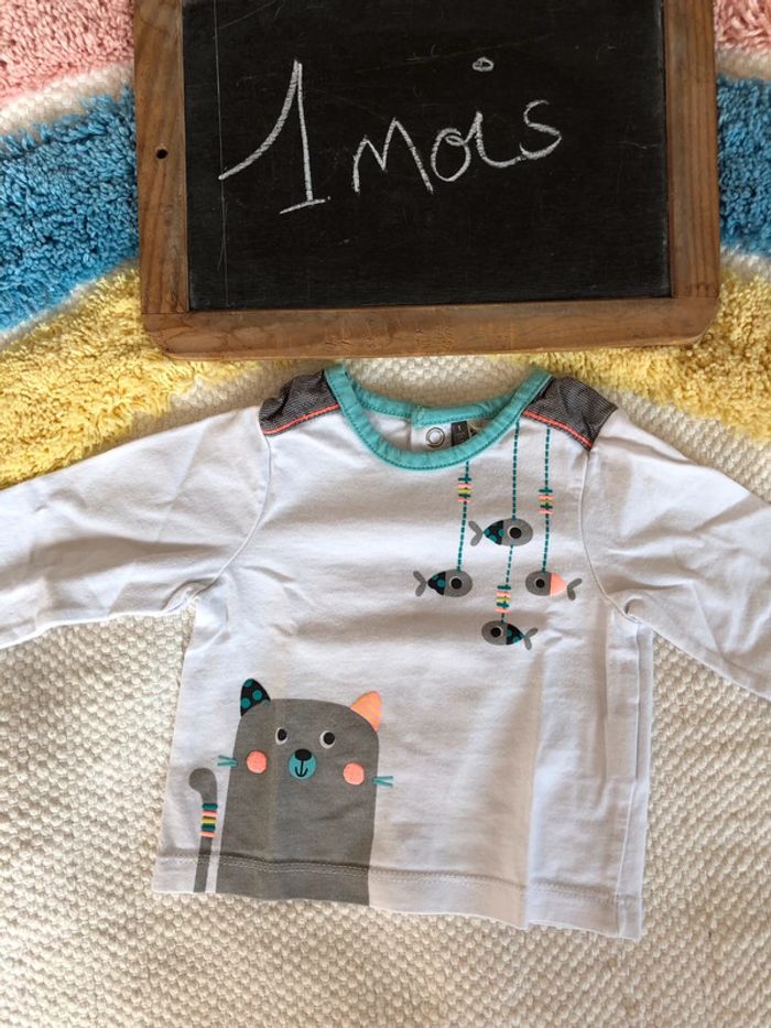 t-shirt manches longues motifs chat et poissons, taille 1 mois, très peu porté #dressing_fille1mois_oreelii