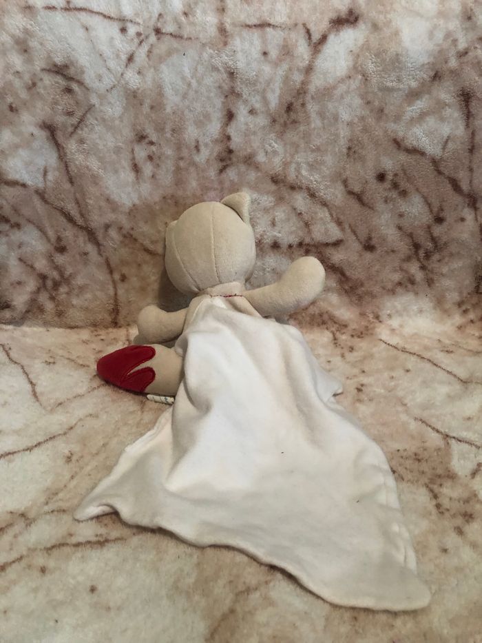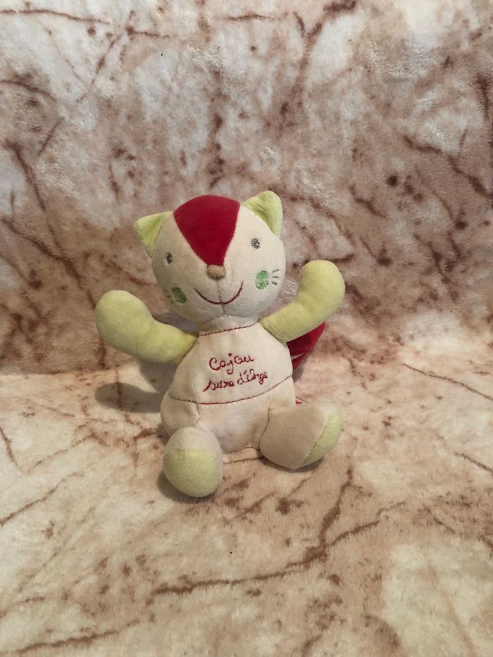 Doudou chat crème, rouge, vert +/- 16 cm Cajou Sucre d’orge Occasion en très bon état Vous achetez le doudou que vous voyez sur la photo