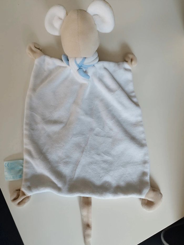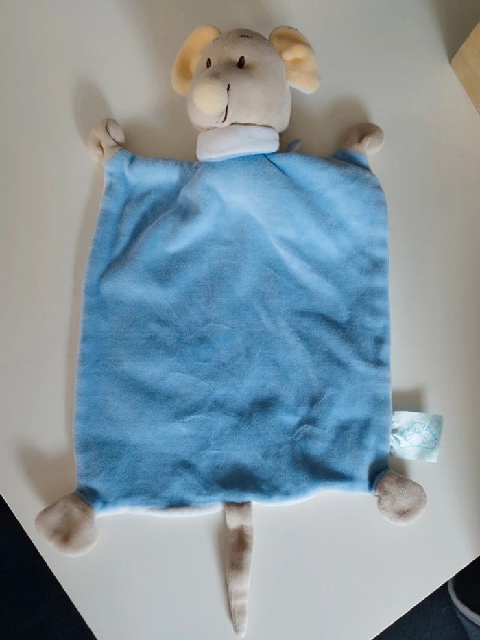 Peluche Doudou plat souris bleu blanc beige écharpe KingBear Très bon état voir photos