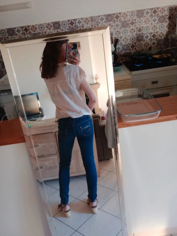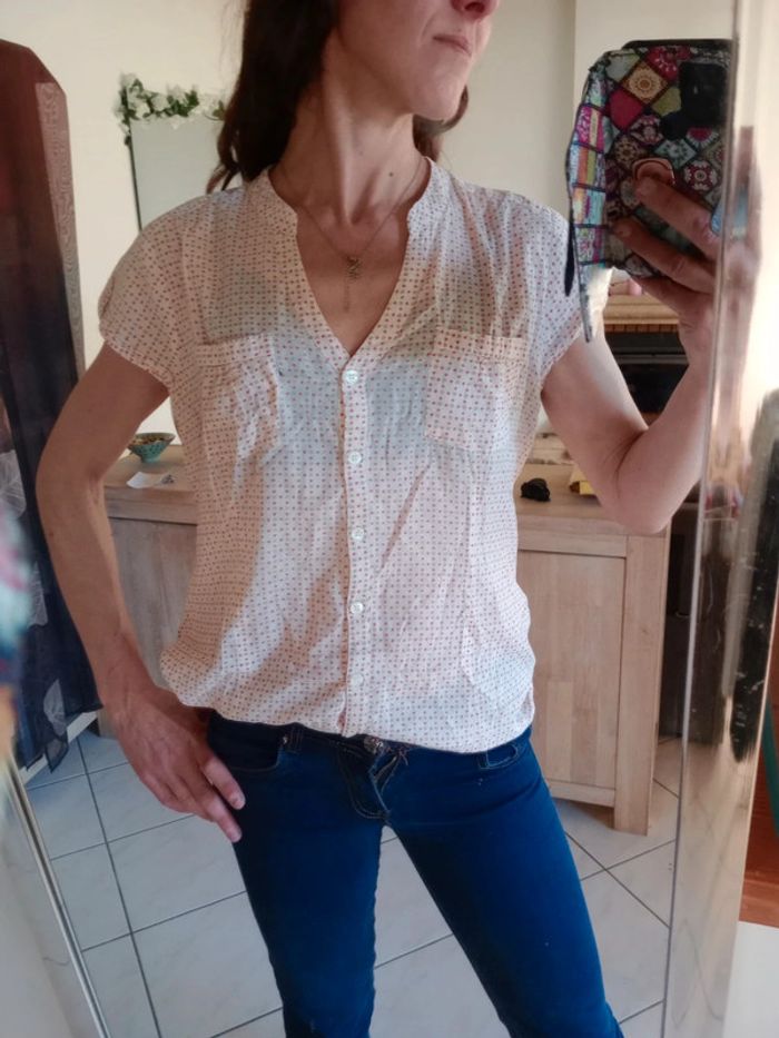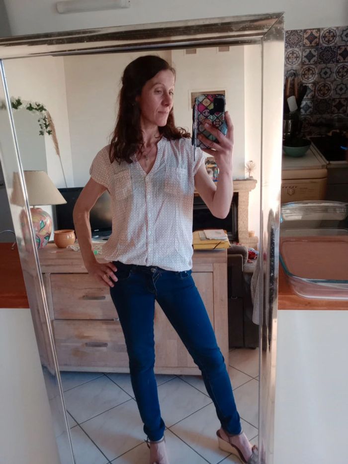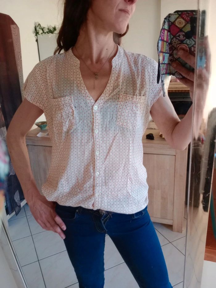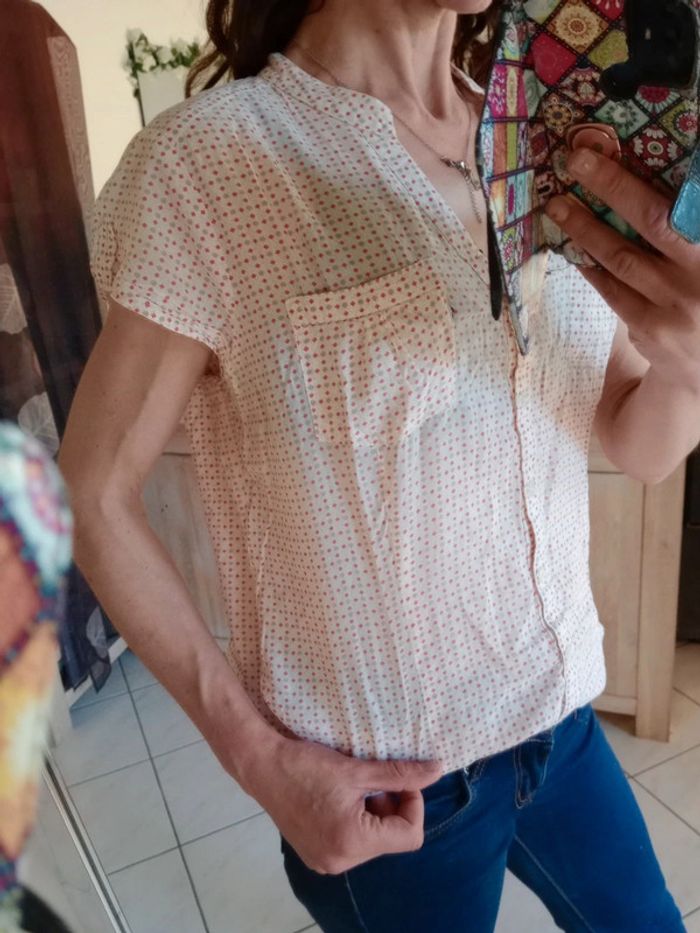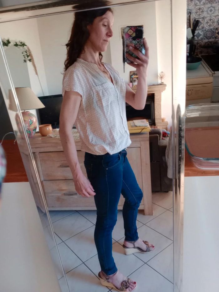 Simple et efficace ,cette jolie blouse dispose d'un col en v et d'un Col type Mao Présence de deux petites poches au niveau de la poitrine Manches très courtes Longueur 66 cm épaule à épaule 38 cm aisselle 59 cm Indiquée taille 44 pour moi c'est plutôt une taille 42 #carineleray_femme_42