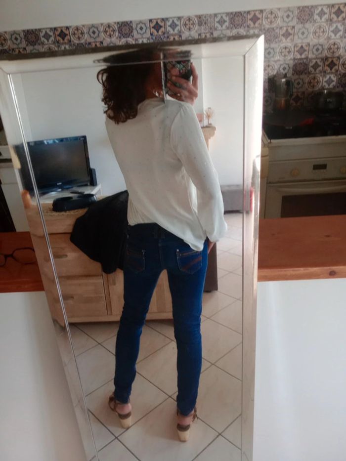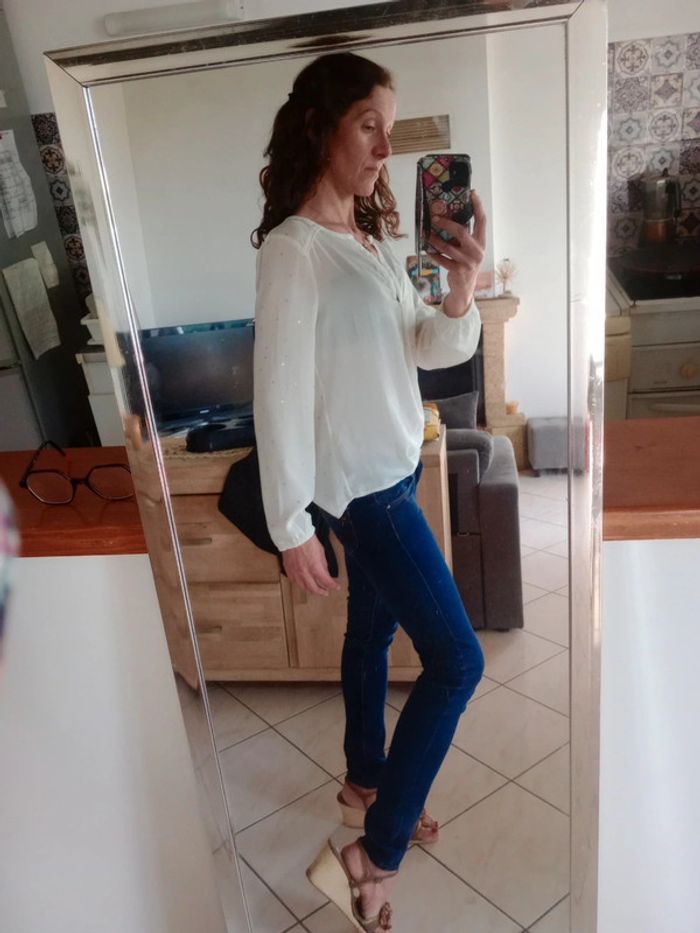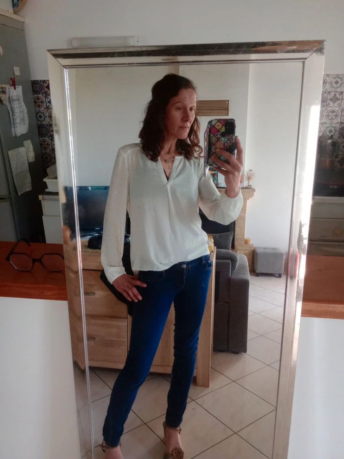 Intemporelle et indémodable, cette blouse passe partout aussi bien pour une soirée que dans la journée Col v Le bout des manches dispose d'une élastique épaule 40 cm longueur 61 pour la partie la plus haute et 66 pour la partie la plus basse Plus d'étiquette matière ni taille Les aisselles sont très légèrement marquées #carineleray_femme_40