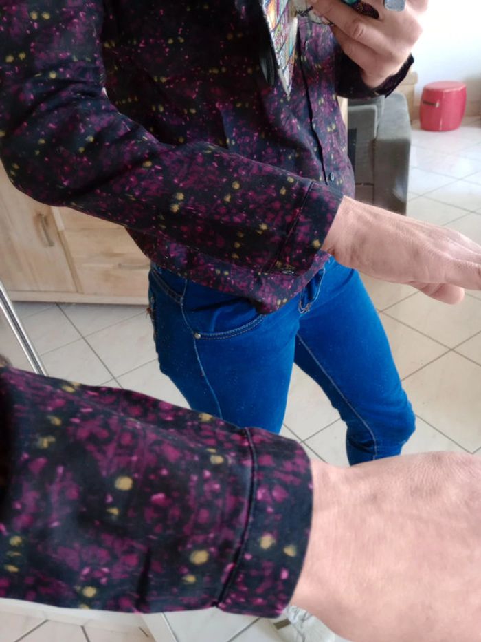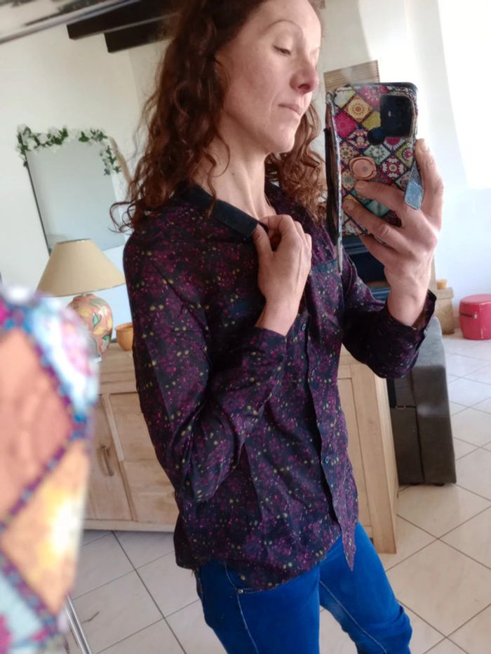 Jolie chemise femme avec deux petites poches au niveau de la poitrine Col noir le reste de la chemise est noire violet avec une touche de moutarde #carineleray_femme_38