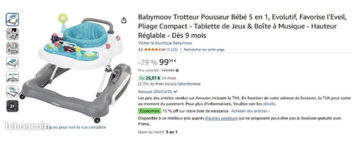 Trotteur récemment acheté sur Amazon, mais mon fils ne l'utilisera finalement pas en raison d'un voyage prévu dans très bientôt. Produit comme neuf et avec beaucoup de fonctionnalités. Voir détail sur Amazon.