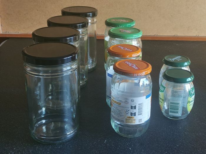 Pots en verre avec couvercle 4 grands de contenance 1L 2 de contenance 738 ml ( compote Andros) 2 de contenance 540 ml 2 de contenance d'environ 250 ml Pour divers conservations ( sucre, farine, fruits secs, confiture, gelée, miel, conserve maison, etc...) N'hésitez pas à me contacter pour constituer un lot personnalisé. Beaucoup de possibilités. Si vous souhaitez que des petits, ou que des moyens, c'est possible.