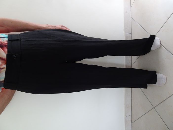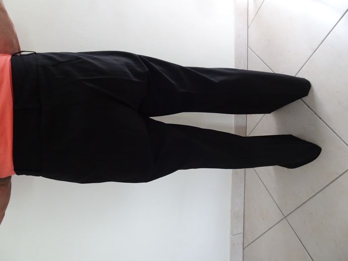 Joli pantalon fluide noir, plutôt habillé, effet côtelé, taille L, fermeture un bouton.