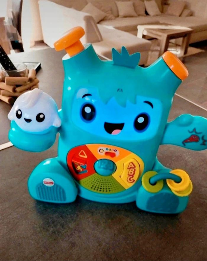 Jeu d'éveil fisher price mon ami Rocki. Valeur neuf 49.99€ Les amis Rocki et Sparki permettent un apprentissage interactif, ils sont ravis de jouer et apprendre avec bébé ! L’adorable duo interagit ensemble et avec votre enfant, avec des lumières, de la musique et des phrases interactives qui lui apprennent l’alphabet, les chiffres et plus encore. Votre bébé adorera explorer les activités et regarder ces deux amis interagir ensemble (et avec lui !) grâce aux lumières éclatantes et aux mouvements rigolos. «Tape m’en cinq ! » Rocki peut même enregistrer ce que vous dites et le répéter de trois voix amusantes ! En outre, grâce à la technologie Éveil Progressif, le contenu d’apprentissage change lorsque votre enfant grandit ! Apprentissage par le jeu - Éveil scolaire : des mélodies dansantes et des phrases initient bébé à l’alphabet, aux couleurs, aux chiffres, aux formes, à l’anglais, et plus encore ! Capacités sensorielles : bébé réagit aux lumières vives colorées, à la musique entraînante, aux mouvements et aux différentes textures. Curiosité et émerveillement : bébé est initié à la relation de cause à effet en découvrant comment faire bouger Rocki et Sparki avec les lumières et les sons amusants ! Quelques traces d'usures