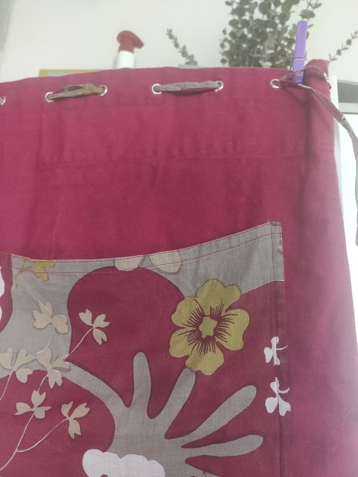 Grand sac à linge ou à ce que vous voulez y mettre. Il est neuf mais il est un peu sali, il faudra le nettoyer. En coton bordeaux avec une grande poche fleurie, lien de serrage sur le haut. Dimension 46,7 cm x 61 cm. Marque Tohubohu
