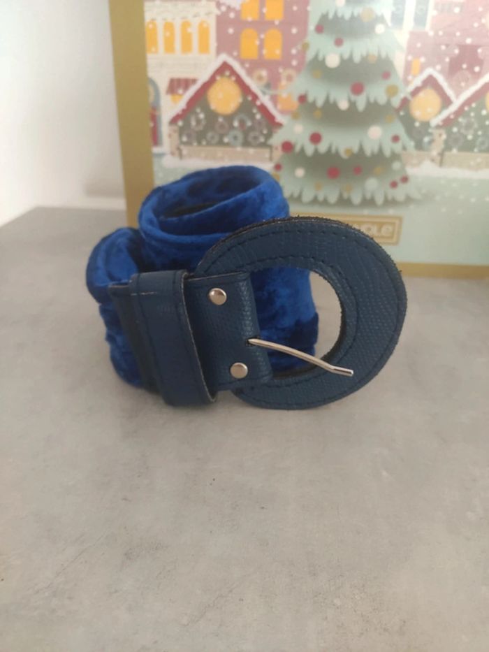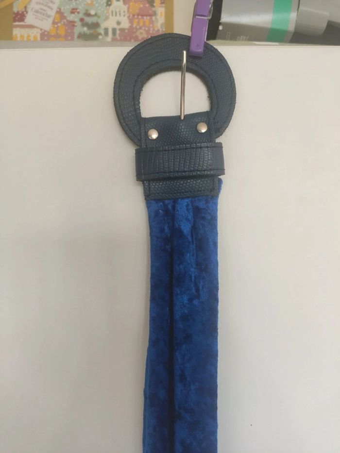 Ceinture originale avec boucle et fin de la ceinture en cuir et le reste en velours d'un très joli bleu. Longueur totale 99 cm, largeur de la partie en cuir 5 cm. Vintage ! Très bon état